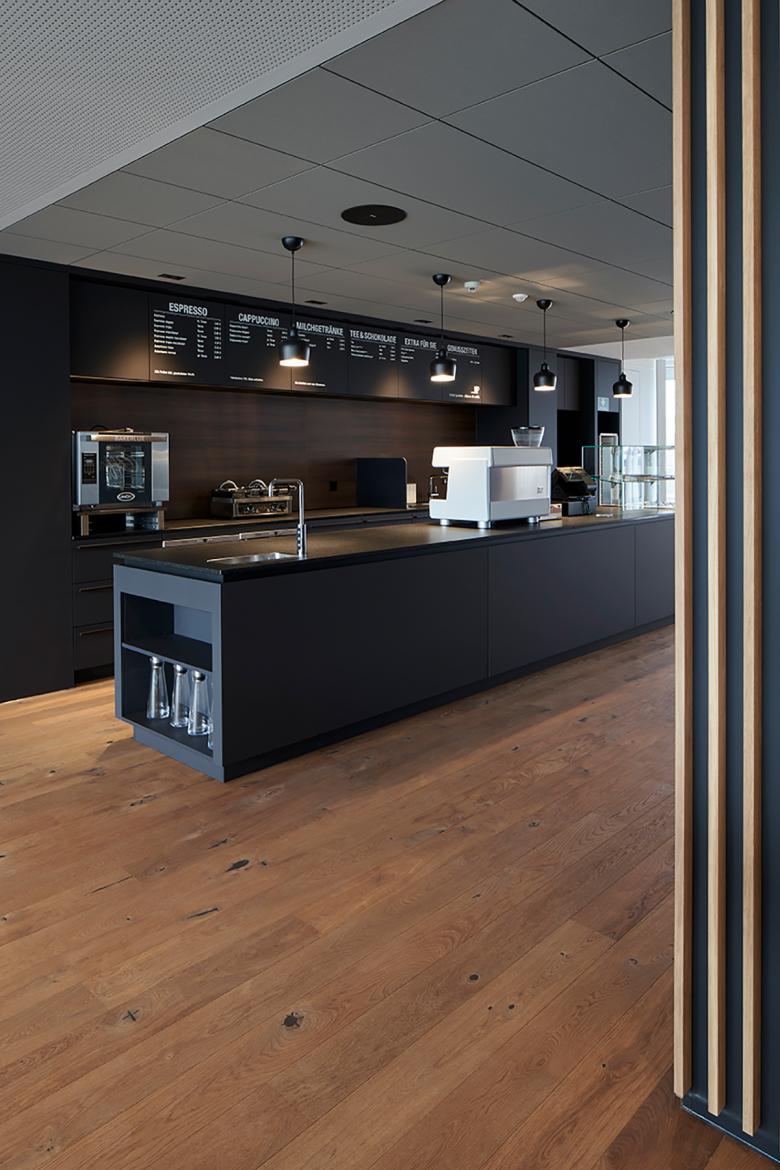 Im 3. OG wurde eine Lounge mit Kaffeebar geplant, von der aus die MitarbeiterInnen direkt auf die Terrasse mit weitem Blick ins Ulmer Umland treten können. Damit ziehen alle Funktionen, die im Bestand nicht umgesetzt werden konnten, in den Neubau.