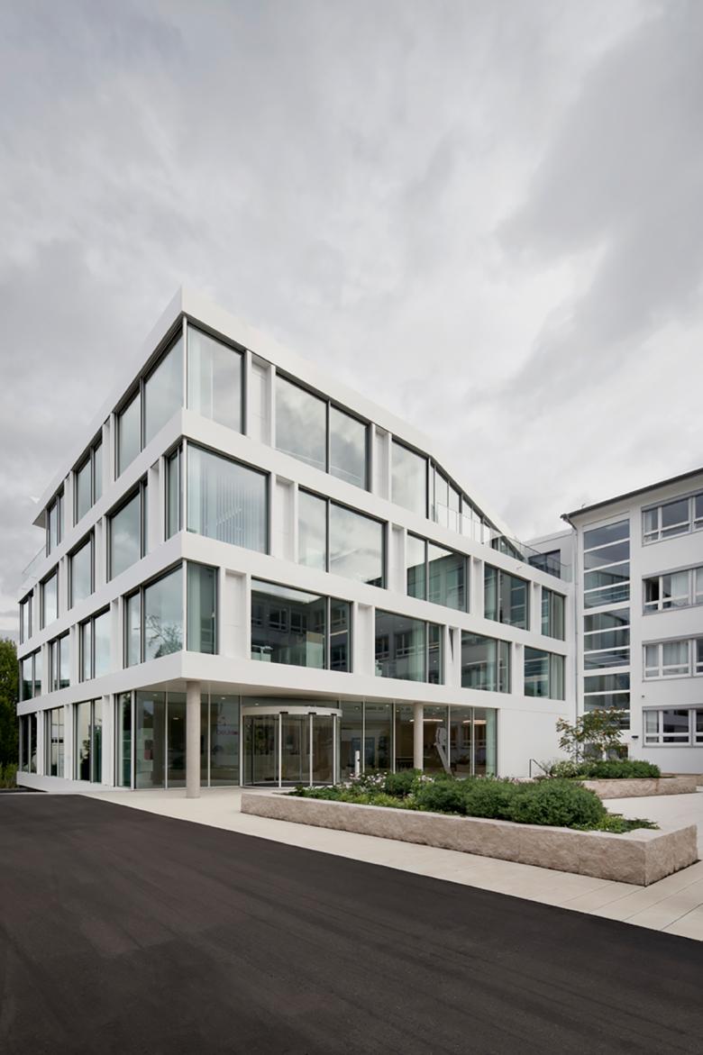 Der Grundkörper des Gebäudes zeigt ein Rechteck und wird im Erd- und Obergeschoss formal „eingeschnitten“, was eine spannungsreiche Eingangssituation sowie zwei Terrassen nach Süden und Norden entstehen lässt. Die Fassade, deren kühles Weiß den medizinischen Aspekt der Unternehmenswelt aufnimmt, orientiert sich am Bestand und führt dessen Formen-Sprache in die heutige Zeit. Die großen Glasflächen, die durch Fenster-Paneele unterbrochen sind, zeigen Transparenz nach außen und lassen viel Licht ins Innere und sorgen so für das Wohlbefinden.