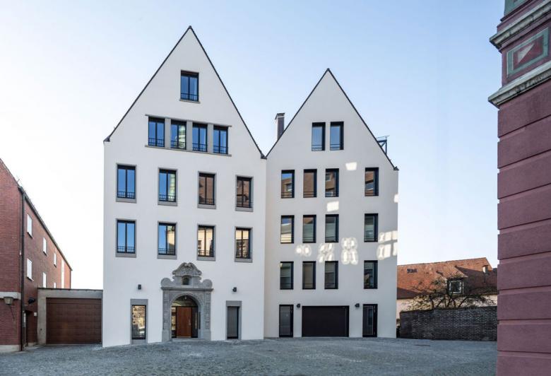 Nur eines davon wurde nach 1945 über den erhaltenen Gewölben wiederaufgebaut. Das andere durch einen Garagenanbau ersetzt. Im Zuge der Neubaumaßnahmen wurden beide Gebäude bis zur Oberkante des Gewölbe im Erdgeschoss abgebrochen. Platz für zwei Bürgerhäuser in zeitgemäßer Architektursprache, mit insgesamt sieben Einheiten: drei Wohneinheiten, drei gewerbliche Einheiten sowie eine Stiftung und Tiefgaragenstellplätzen.