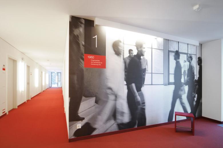 Die Auswahl von Mobiliar, Farben und Accessoires erfolgte nicht nur unter dem Aspekt der Langlebigkeit, sondern auch mit Fokus auf gesundes Wohnen mit schadstoffarmen Materialien. Darüber hinaus erzeugen gegensätzliche Materialien wie weiches Holz kombiniert mit Stein optische Lebendigkeit. Die Leitfarben Orange, Hellblau, Hellgrün und Rot, die die einzelnen Etagen individualisieren, stellen eine Hommage an die Hochschule für Gestaltung Ulm dar, deren Designobjekte ebenfalls in die Ausstattung des Hotels integriert und somit erlebbar gemacht wurden.
