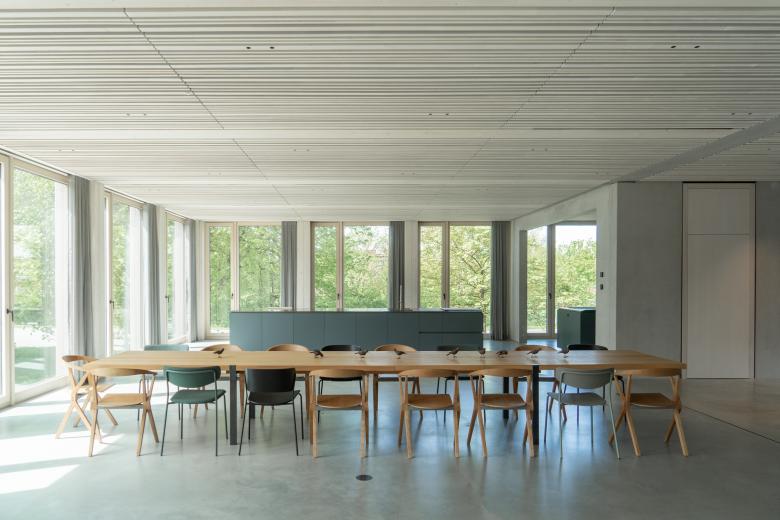 The ceiling construction, which visually connects all four levels, is particularly impressive. The material concept of wood and concrete is complemented by natural materials. Each floor has its own color concept - from light mauve to cobalt blue and petrol to dark yellow - giving it an unmistakable identity, with the color intensity following the intensity of use.