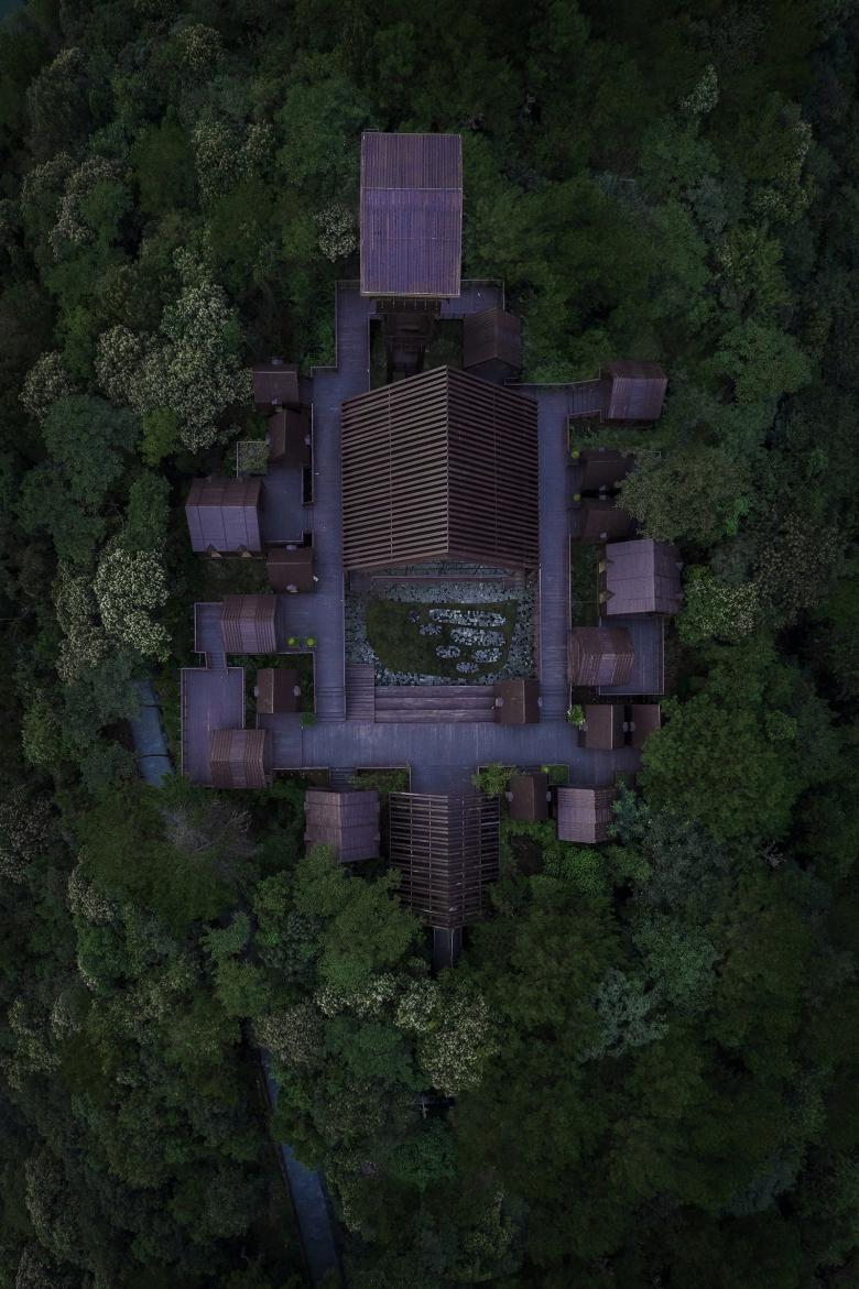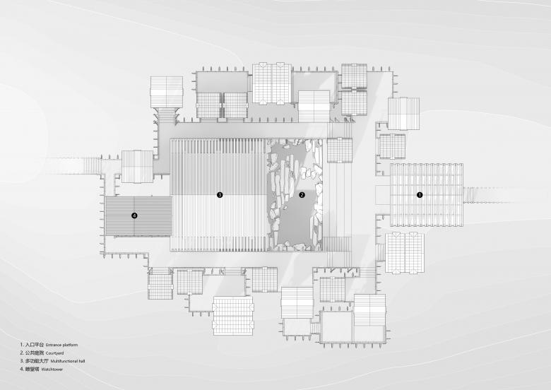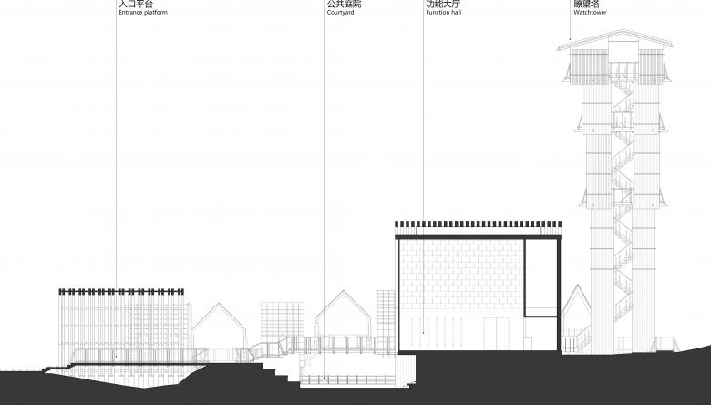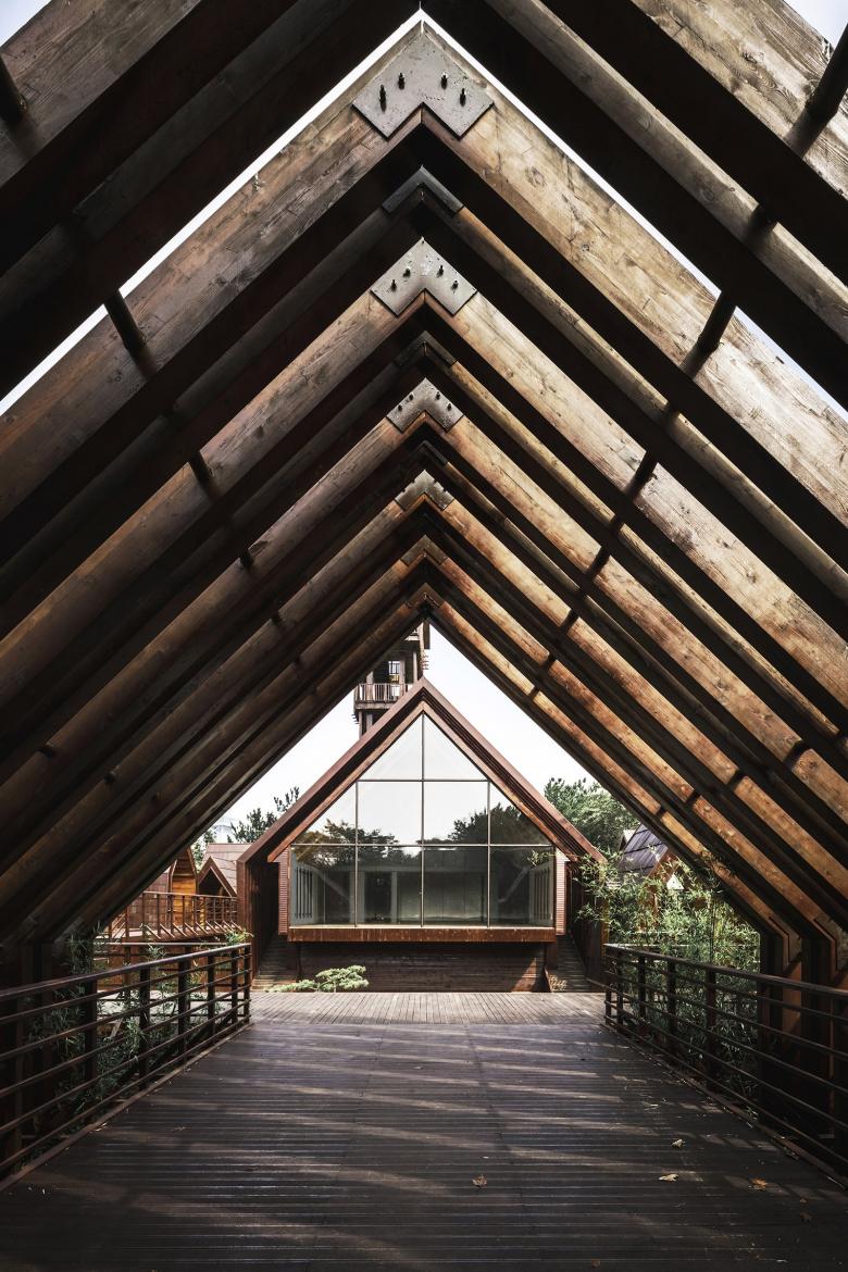 materials and the environment that has been going on for several years.What is more special is that at the beginning of the design, program to introduce have not yet been determined. Therefore, while the space itself constitutes a landscape system, the owner also put forward requirements for the ductility and adaptability of future functions. We have conceived and listed some program that may be implanted here, which also serve as part of the basis for the design of the wooden cabin.Based on the multiple possibilities in the future, the three types of wooden cabins evolved show different structures, scales, and openness. The "hollow" design also reserves space and structural foundations for later development.The multifunctional hall on the central axis of the "town" is an enlarged version of the small wooden cabin, like an "instruction" for the future functions of the three types of wooden cabin modules, and it is also the only space in the "town" that introduces indoor functions. The top of the ceiling is covered with shingles.