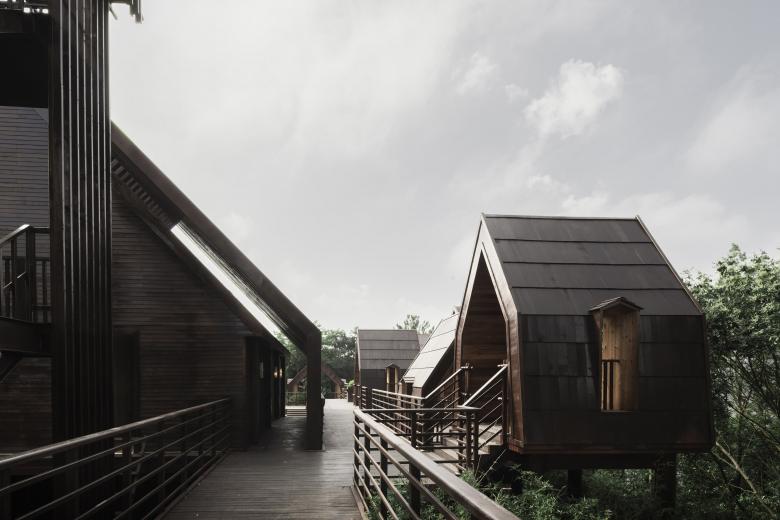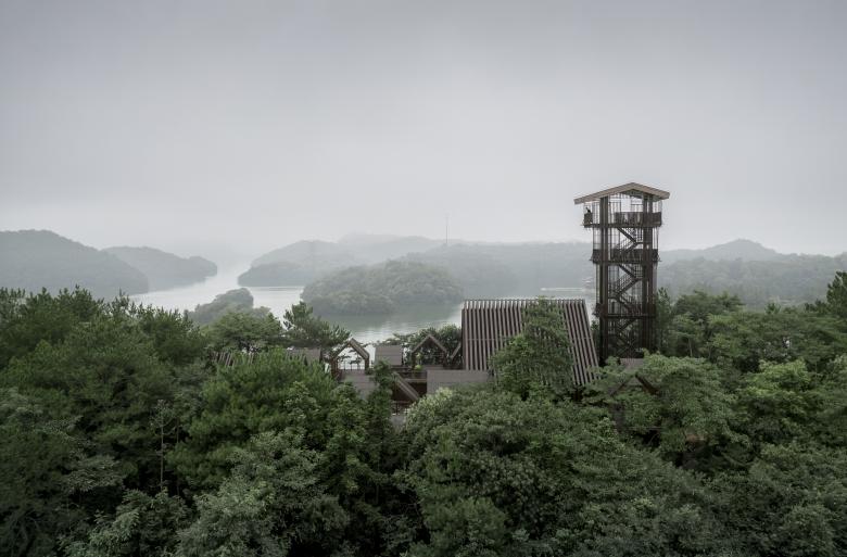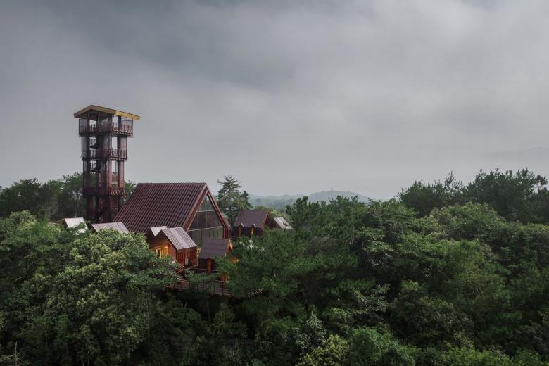 The Wooden Cabin Town is located on an island in the West Sea of Lushan, southwest of Jiujiang, Jiangxi. It was designed by Shanghai Parallect Architecture Studio. The predecessor of this water area is Xiu River, one of the five major rivers in Jiangxi. From the 1950s to the 1970s, the Xihai Barrage, known as Asia's largest dam, was built here, and it formed a unique island in the lake area: like clusters of jungle floating above the water. And what we hope to present is a cluster of small wooden cabins floating above the jungle.The design includes a 24-meter-high observation tower, a multi-functional hall, and 19 prefabricated forest wooden cabins.The fusion gesture between the building and the lush natural cork oak forest on the island is the starting point of the project. Therefore, as the core part of space upgrade project of the island, new building is constructed entirely on the basis of the demolition of the old building. The integrated design makes it easier for the wooden cabin to be transported to the island for assembly. The wooden cabin is elevated by an independent foundation, and the ground is repaired and restored. The waste from the demolition of old buildings is also buried in situ as much as possible to become the foundation of the multi-functionalhall.The design of masterplan owes much to the site and nature rather than the architect: the surrounding trees determine the boundaries of the building. The rules of core space and edge expansion are made: the axis of new buildings is set in the core area of the original architecture, and buildings are filled in the blank area among trees.Compared with the rigid rules and rigor, we hope to introduce more bottom-up adaptability and spontaneity in this project which chases the wild fun of the jungle.Thanks to such natural endowments and design strategies, the final proposal is breathing: 3 types of cabin modules are embedded in the site, and the platform presents a rhythm of different heights to adapt to the terrain. The orientation and openings of the wooden cabins are carefully arranged to make them a viewing frame for each other. The main material of the cabin is Hongxue pine wood with insect-proof and anti-corrosion treatment, which still exposes the original wooden texture. We don't even want this place to look like a clean and tidy new building, but rather an intimate dialogue between