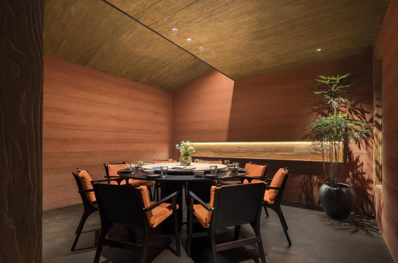 The private dining rooms feature concrete floors and red earth walls. The use of red rammed earth returns to the essence of bricks, employing a technique of deconstruction, reorganization, and reconstruction to conclude the story of the "Under Clouds" restaurant at the West Bund Dream Center. The wooden ceiling and lighting create a relaxed atmosphere for group dining.