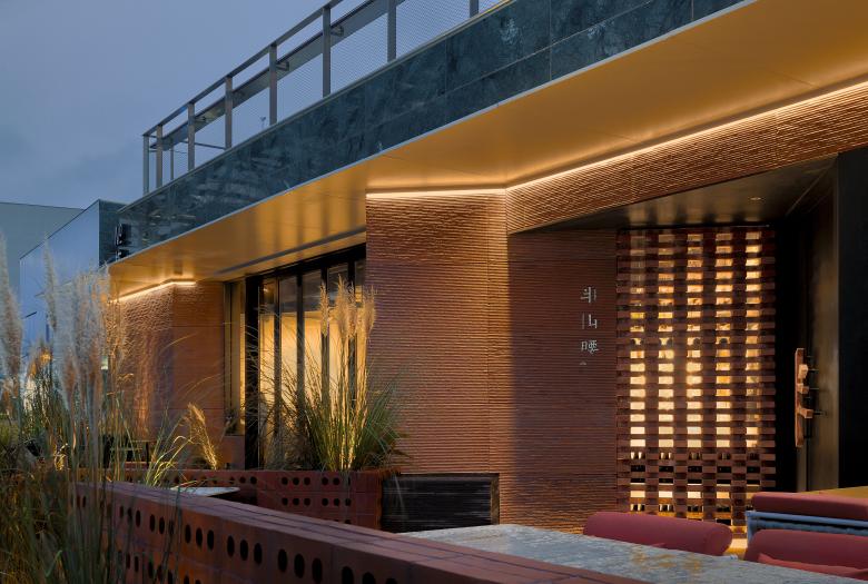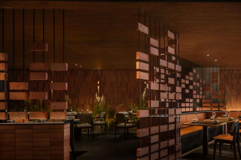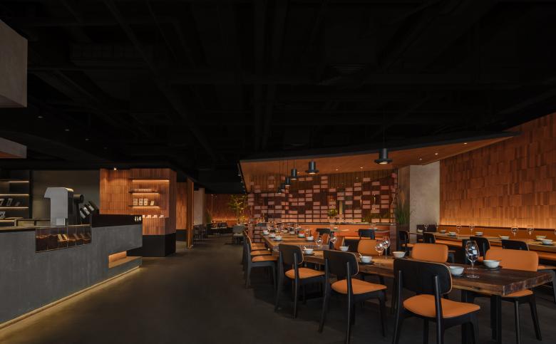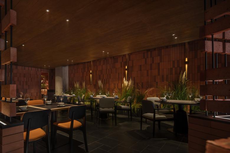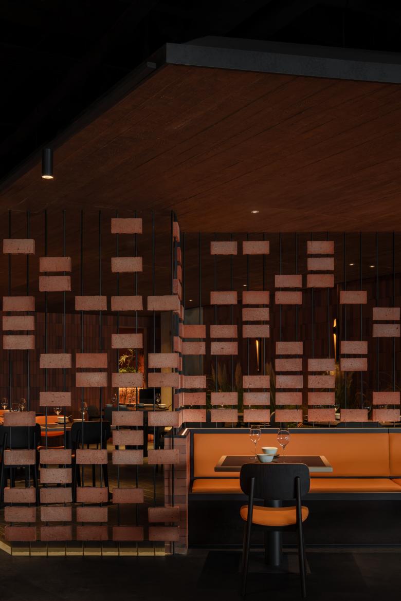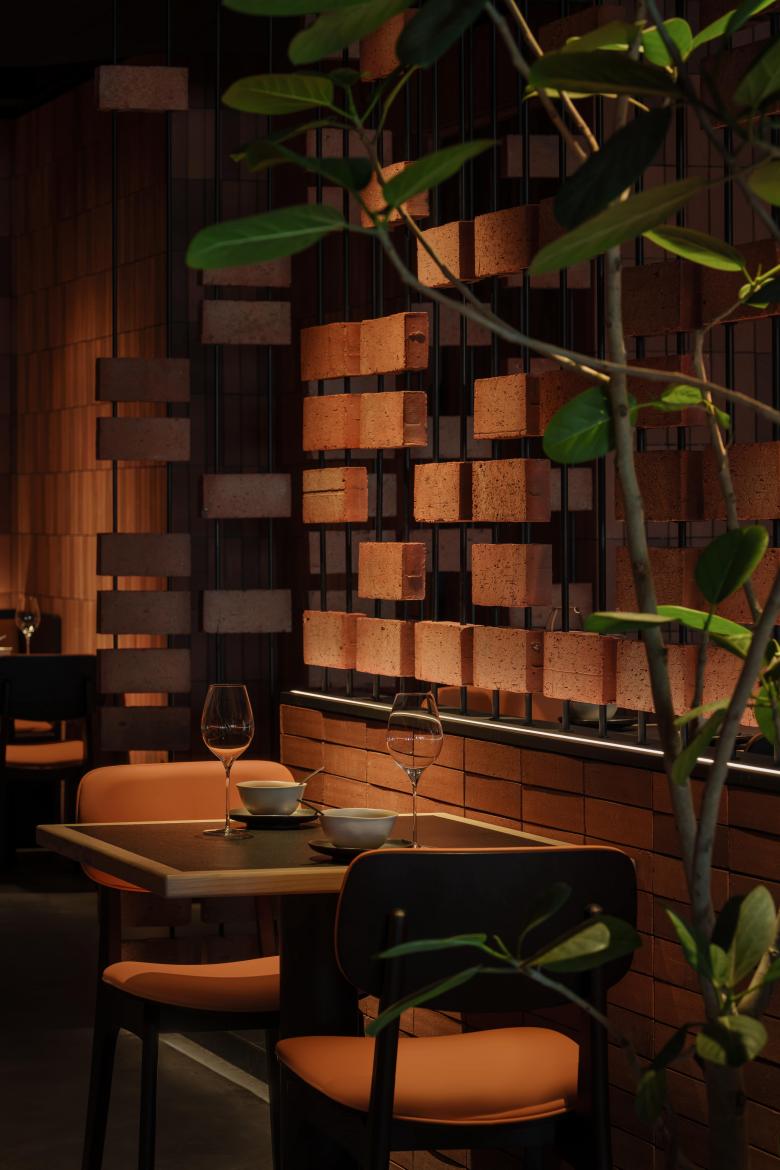As the open dining area transitions to the semi-private dining area, we used suspended red bricks to create partitions. The staggered arrangement of the hanging red bricks resembles dancing musical notes, infusing the dining space with dynamism and playfulness. It gives the entire environment a light and rhythmic ambiance. By raising the ceiling in certain areas, we created unique dining spaces that encourage visual interaction among guests. The ceiling features GRC wood-patterned concrete, designed as a "primitive wooden hut" using modern language. Landscape plants are arranged along the walls, using the scents of materials and ingredients to immerse diners in the rustic atmosphere of Yunnan.