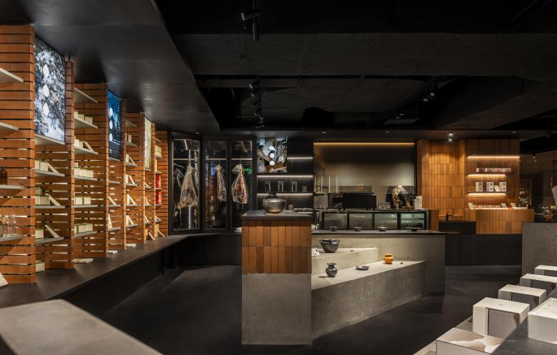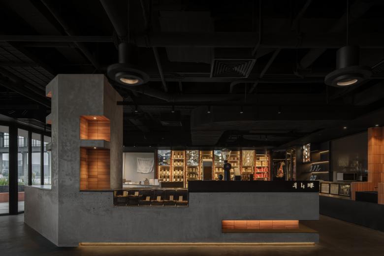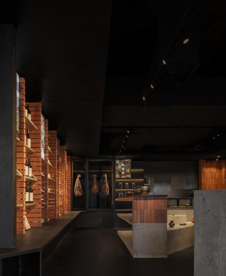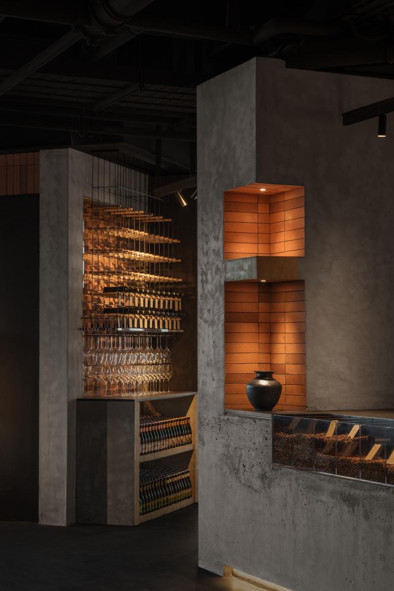 In the cultural zone, we predominantly used concrete with less red brick, combining it with weather-resistant steel for a touch of sophistication. As the first Under Clouds restaurant to introduce a cultural retail + dining concept, we designed the space to connect with the original dock, facilitating a dialogue across spatial and temporal dimensions. Consequently, the flow of space between the cultural retail area and the dining zone is rotated by 45 degrees. The cultural area, designed as an exhibition and sales space, features an open island bar, allowing every customer to engage in food preparation, while simultaneously learning about the brand and Yunnan, enriching the dining experience and adding warmth to the space.