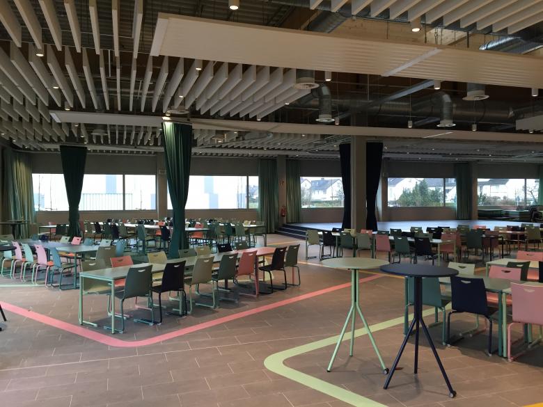 Zur Umsetzung einer schulpolitischen Maßnahme bedurfte es sowohl eines Neubaus als auch des Umbaus und der Sanierung bestehender Gebäudekomplexe aus den Jahren 1958 bis 2007. Die Neubaufläche beträgt ca. 5900 m² NGF, die Umbaufläche liegt bei ca. 1000 m² NGF. Die Planung durch die Stadt setzte auf ein neues Konzept: Anstelle traditioneller Klassenzimmer und Schulflure wurden eine Reihe von neuen Raumtypologien entwickelt. Räume für Gruppenarbeiten, Projektarbeiten und Hausaufgaben sowie auch kreative und körperliche Aktivitäten sind auf dem Schulgelände vorhanden. Durch die Gebäudekonstellation bilden sich mehrere begrünte Höfe. Eine lange innenliegende Schulstraße verbindet alle Gebäudeabschnitte und schafft Raum für Lernen und Rückzugsorte. Die Mensa, ein zweigeschossiger hallenartiger Luftraum, bildet die lebhafte, farbenfrohe und soziale Mitte der Schule. Sie bietet Platz für 500 Schüler und ermöglicht verschiedene Aktivitäten, den Austausch der Schüler miteinander und die freie Entfaltung ihrer Kreativität. Die Mensa kann durch Raumteiler schnell in eine Aula mit Bühne, Tanzfläche oder verschiedene Arbeitsbereiche für parallele Gruppenarbeit aufgeteilt werden. Die Bibliothek mit Bücher- und Zeitschriftenarchiv bietet einzelne kleine Räume (Holzhäuschen) für unterschiedliche Arbeitsformen und persönliche Gespräche. Eine Schule im Ganztagsbetrieb ist heute nicht mehr nur ein Lern- sondern auch ein Lebensort.