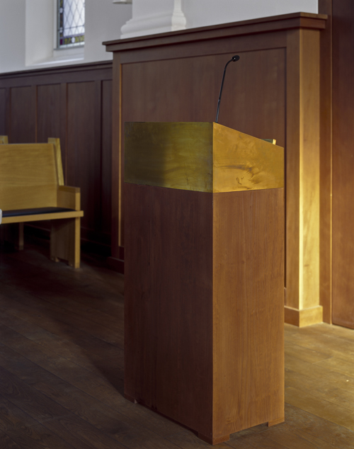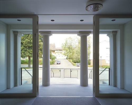 Der wichtigste architektonische Eingriff war die Rekonstruktion der Eingangshalle mit dem mittigen Eingang. Damit ist die ursprüngliche Sequenz des Eintretens wieder erlebbar: Vom Dorfplatz erreicht man über fünf Stufen den Kirchhof. Über weitere fünf Stufen gelangt man in die Vorhalle. Auf der Mittelachse geht man direkt in die Querkirche (Eingang-Taufstein-Kanzel). An der Stelle des Haupteingangs konnten wieder die alten Türen eingesetzt werden, die 33 Jahre im Estrich eingelagert waren.