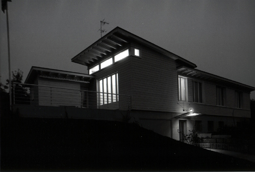Wegen der Bauherrschaft wurde ein eingeschossiges Haus vorgeschlagen, ein Holzbau. Dieser sitzt auf einem betonierten Sockel, der dem Gefälle des natürlichen Hanges entgegensteht. Die  Ausrichtung auf die  Aussicht bewirkte ein Öffnen des  Grundrisses und ein Abdrehen des Wohnzimmers nach Westen, Richtung Dorf. Dieses Drehen des Wohnzimmers wird auch durch das Pultdach sichtbar gemacht.  Die letzten Strahlen der untergehenden Sonne beleuchten durch die Oblichter die geneigte Decke, während die restlichen Zimmer schon im Dunkeln liegen. Durch diese wenigen “Anpassungen” an einem konventionellen Südtyp, entsteht ein moduliertes Volumen, das sich als eigenständiger Baukörper präsentiert.