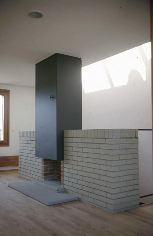 Der Eingang bildet zusammen mit dem Wohnzimmer, der Küche und dem Esszimmer einen grossen durchgehenden Raum. Die anderen Zimmer sind konventionelle Raumzellen. Die beiden Raumtypen sind entlang einer horizontalen und einer vertikalen Erschliessungsachse angeordnet. Durch dieses Entwurfsverfahren entstand eine Volumenkomposition mit ausgreifenden Flügeln, zweigeschossigen Körpern und Vordächern.