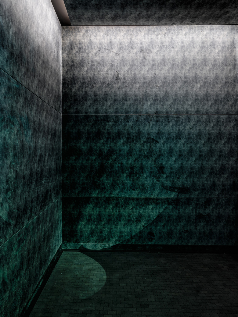 Durch die Fensterfronten an der Langstrasse, der Brauerstrasse und von der Hofseite gelangt Licht in den erdgeschossigen Innenraum und aktiviert je nach Tageszeit das monochrome Deckenkunstwerk aus Veloursteppich des Künstlers Tobias Hantmann. Die Teppichfasern des Deckenbilds transportieren, absorbieren und reflektieren das einfallende Licht sehr unterschiedlich. Es werden damit Farbtöne von silbergrau bis tiefgrün erzeugt, die mit Kunstlicht verstärkt werden können. Grosse, samtbespannte Biegesperrholzobjekte an den Wänden fungieren als sowohl als Sitzmöbel und als auch als weiche Akustikabsorber.