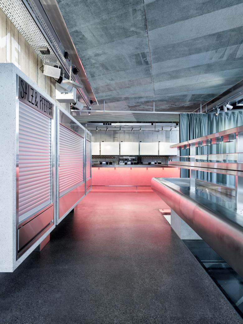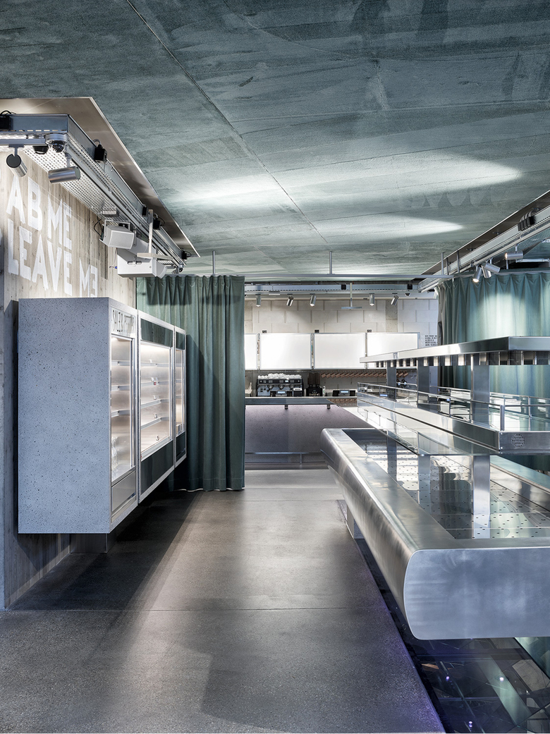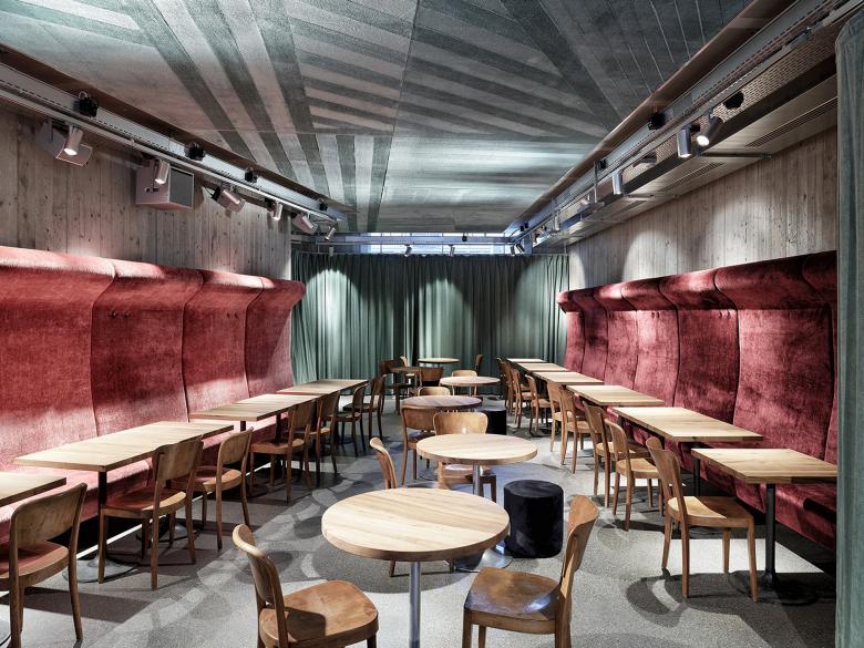 Das Restaurant besteht aus einem ca. 300m2 grossen Gastraum, der sich U-förmig um den innenliegenden Erschliessungskern legt. Betonoberflächen an Boden und Wänden sowie rohes Mauerwerk verleihen einen rauhen Gesamteindruck. Textilien verleihen dem Raum eine weiche, sinnliche Atmosphäre. Zinn, Beton, Samt, Velours bilden Kontraste im Innenausbau. Ein Oberlicht mit fragmentierten Spiegeln und Halbspiegeln verbindet das Restaurant im EG optisch mit dem Clubraum im 1.UG. Im hinteren Raumteil befinden sich zwei lange Beton-Zinntheken, die im Tagesbetrieb als Verkaufstresen und im Nachbetrieb als Bars genutzt werden.