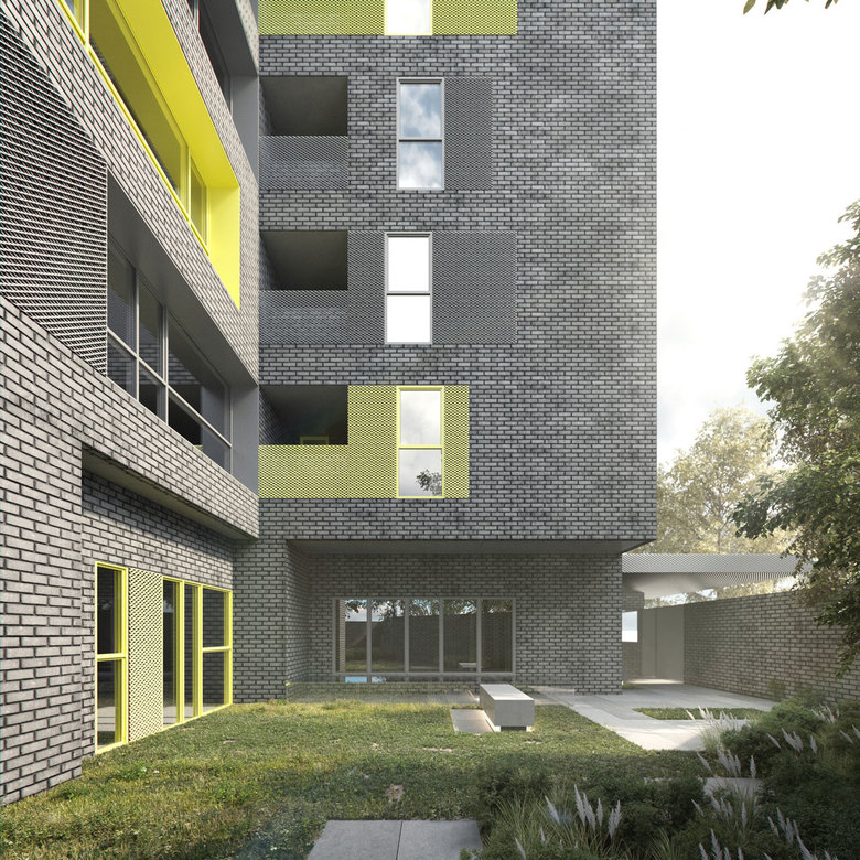 With the objective to create a modern yet unusual façade that stands out from its surroundings, a brick-look façade made from specially developed, weather and erosion-resistant tiles was designed as the shell of the apartment complex. Coloured expanded metal connects the window elements and structures the façade. The colour of the window frames corresponds with the colour of the expanded metal, creating a harmonious yet dynamic look in combination with the light grey brick structure.