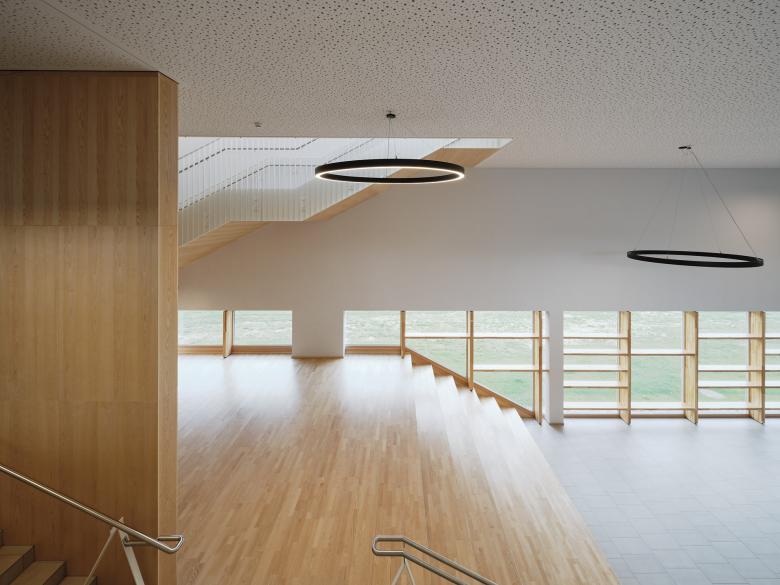 This Aula is an open space for life and action, conceived for the programs that accompany the teaching: these include day care facilities as well as various events. The leisure spaces are directly integrated in the Aula area – although they can be separated –together with the seating steps they form a generously dimensioned zone for a wide variety of activities. The library, an important part of the overall educational concept, is also integrated here and stimulates a playful approach to reading. The seating steps can also be used as an auditorium for the nearby ZMS or, conversely, as a stage for performances.