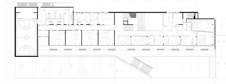 First of all, sufficient open space was to be left to provide areas where the pupils can move around freely. In response to the narrow shape of the site the building was conceived as an elongated, stepped three-storey volume.