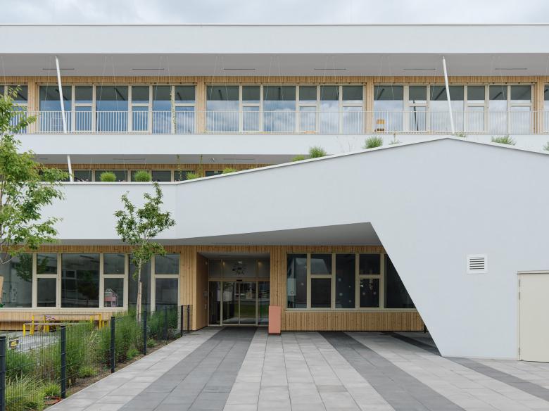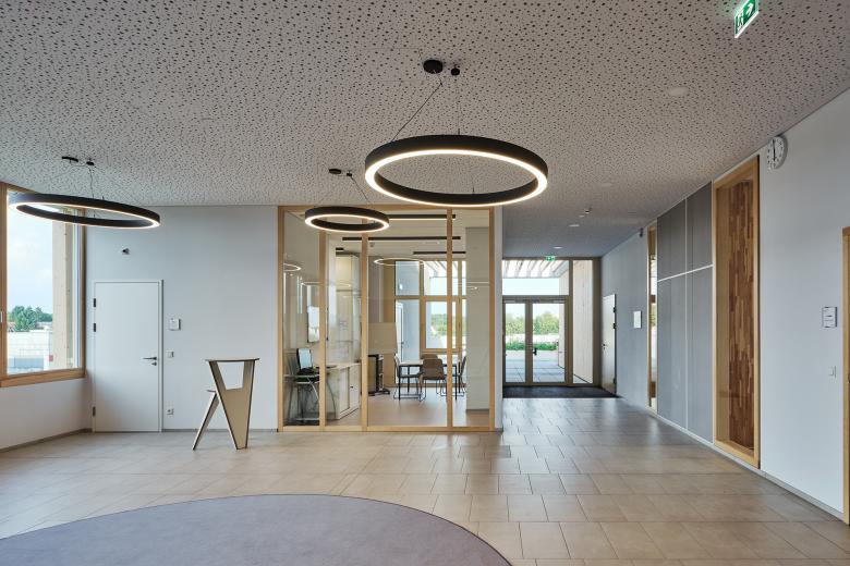 Access to the ASO with its own draught lobby is along the circulation “street” and – in accordance with the requirements of the educational concept – is moved away from the main VS/ZMS entrance, so as not to distract the children excessively. Nevertheless, after entering the building you can take a direct and short route to the central Aula (assembly hall).