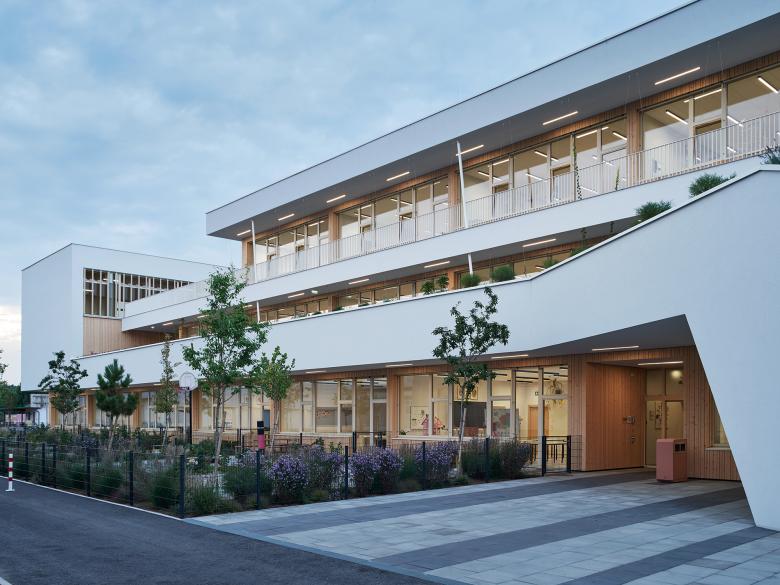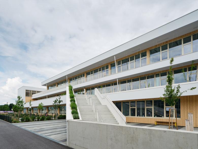 The schoolyard takes up the clear idiom used in the entrance area. In front of the special school there are outdoor areas, separated by luxuriant planting, allocated to each of the classrooms. A separate entrance for this school type opens towards the south, ensuring safe arrivals. The school yard for the primary school extends through three storeys. On the ground floor the design approach used in the special school is continued. A staircase, flanked by planting on the façade of the building that also provides a visual screen for the special school, leads to the first floor. Planters with ornamental grasses divide up the terrace and continue the green design theme. On the second floor there is, additionally, a larger planting bed that provides a garden area that can be used for instructional purposes.