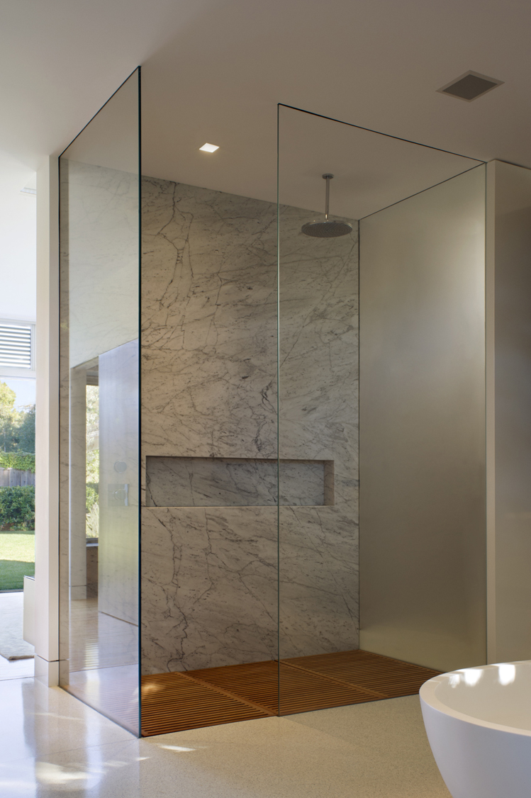 The backyard landscaping is open to both the main living space and the more intimate bedroom, while ceiling-hung curtains stretch across the glass to provide privacy when needed. The home turns inward in the serene, private experience of the owner’s bathroom, where the warmth of the delicately spaced wood shower floor grate and tall closet doors come together with dramatically veined gray marble and subtly speckled cream terrazzo, creating a soothing and tactile experience.