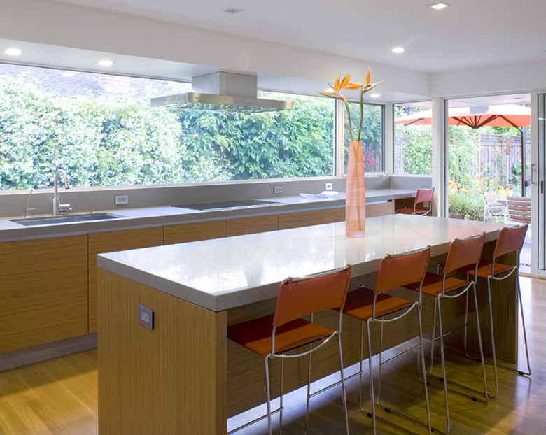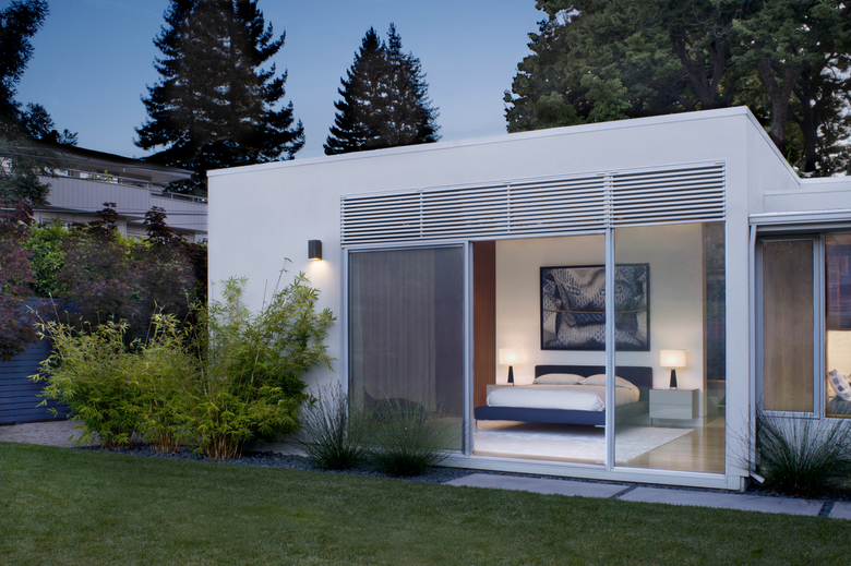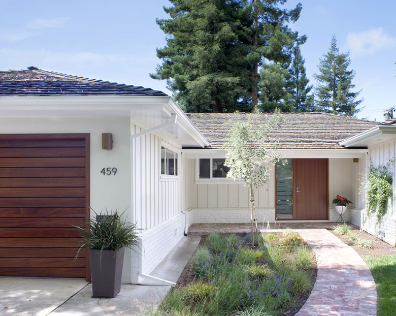 On a tree-lined site in Menlo Park, a 1960s ranch house becomes a polished home that embraces the indoor-outdoor possibilities of life in California. On approach, the house is humble, its low-pitch hip roofs extending past the facade walls to create shallow brows that shade the front of the house. As a stone path slips by the protruding garage volume, a modestly scaled entrance emerges. On this side of the house, there are few apertures; entrance into the interiors reveals an L-shaped glazed expanse that connects the living spaces with the verdant landscape in the backyard.