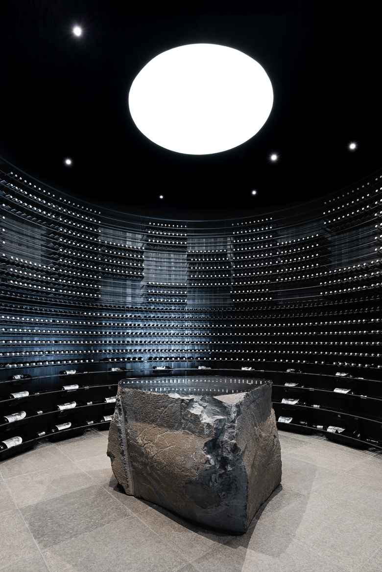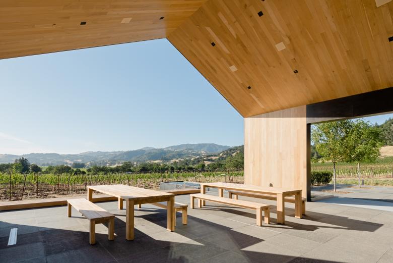 Materially, the project weaves in the unique character of its site and history into this pure form. These exterior walls are made from 100-year-old wine tanks from Mondavi, one of the valley’s pioneers in winemaking, and inside, the entry stair in the production department is built from the wood of oak wine barrels, the red stains purposefully left. The scent of wine permeates the space, until you step outside, when the scent of herbs from the raised gardens fills the breeze. Thinking of the central role water plays in the region, the near-net-zero-water facility is cut through by a reflective pool running alongside the tasting room; on sunny days, the pool reflects the landscape and architecture, bringing the project’s many layers of articulation – gravel, concrete, tree, siding, grass, glass, wood – together on a single plane.