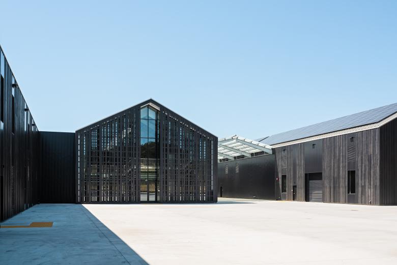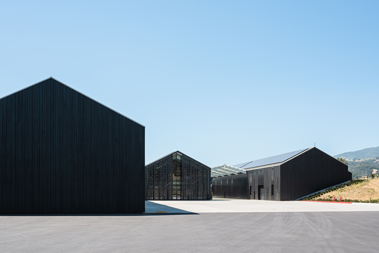 Silver Oak is seated gently in its site; from a distance, all but its metal, gabled roofs are hidden by the tall rows of vines. The shape references the dominant barn form of the area, here reduced to its simplest clarity. With no overhangs, the metal roof almost disappears as you face the buildings directly, and instead the architecture is dominated by the deep tones of the exterior walls.