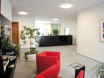 Die bestehende t-förmige Erschliessung wird durch einen zusätzlichen Seitenflügel für das Front-Office und den zur Wartenische vergrösserten Stichgang zu einem unregelmässigen Kreuz erweitert. Das Rathaus erhält dadurch einen zentralen Eingangs- und Empfangs-Bereich. Herzstück des neuen Front-Offices ist eine freistehende Theke. Nicht das Prinzip des klassischen Schalterbetriebs stand hier Pate, sondern die Idee einer Rezeption.