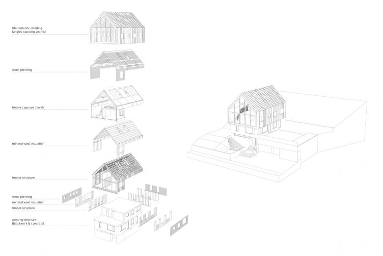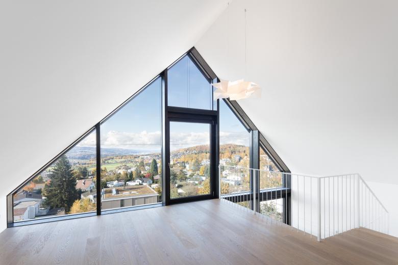 This house in Zurich was originally built in the 70's. It is part of our upcycling series, aiming at the reduction of grey energy waste in the building industry. Instead of demolishing and rebuilding the entire house, we decided to preserve all valuable building parts and to add a rooftop addition constructed with prefabricated timber elements. Now, the renovated house fulfils highest energy saving standards. A titanium zinc cladding packages old and new building parts into one consistent volume. As a response to the location of the site with fantastic landscape views, the gable facade of the upper floors has been fully glazed.