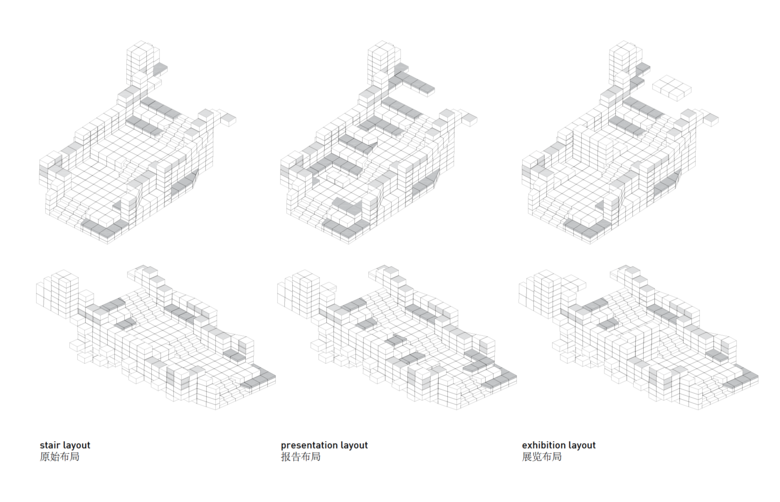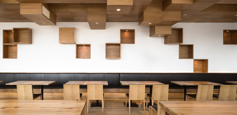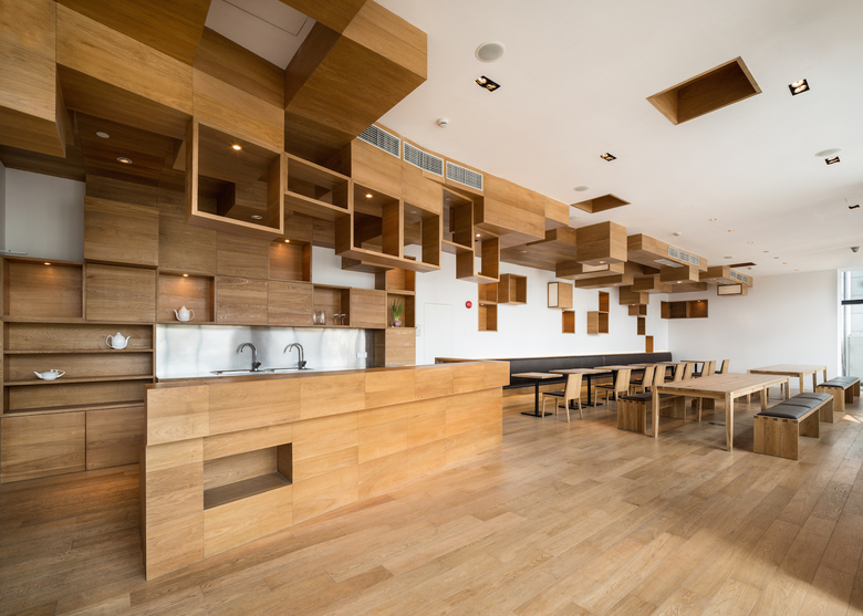 A pixelated assemblage of oaken boxes seems to grow through the three lower floors of the building, generating a spatial continuum throughout the different levels. The central stair has been designed as a flexible playground for different events. Modular cubes can be arranged in specific layouts to cater to various programs like presentations, exhibitions, public receptions and informal meetings. A public restaurant, private dining rooms, and an organic food store are connected both visually and physically to this central space.