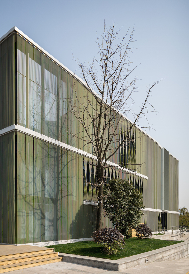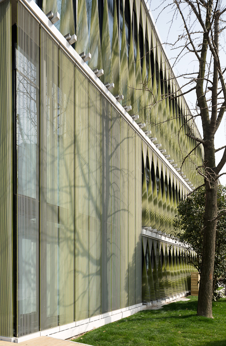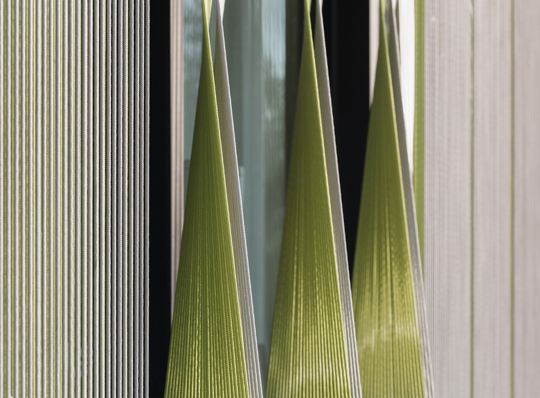 The resulting shading system is made of two layers of differently colored strings. The overlap of the two layers creates a moiré effect that reinforces the textile-like aesthetic of the skin. The façade is comprised of a series of panels, each consisting of 46 strings. The use of single strings instead of a continuous fabric allows the panels to twist in a controlled and specific way. The shape of the twisted panel allows for ideal sun shading conditions while simultaneously opening up views towards the river. Groups of panels can be individually controlled in order to adapt to specific functions in different areas of the building. A layer of LED lights behind the panels enhances the three-dimensional effect of the façade during the night. The illuminated panels act to increase the level of privacy by obscuring views from the outside in, while preserving the compelling vistas from the interior to the surrounding urban environment.