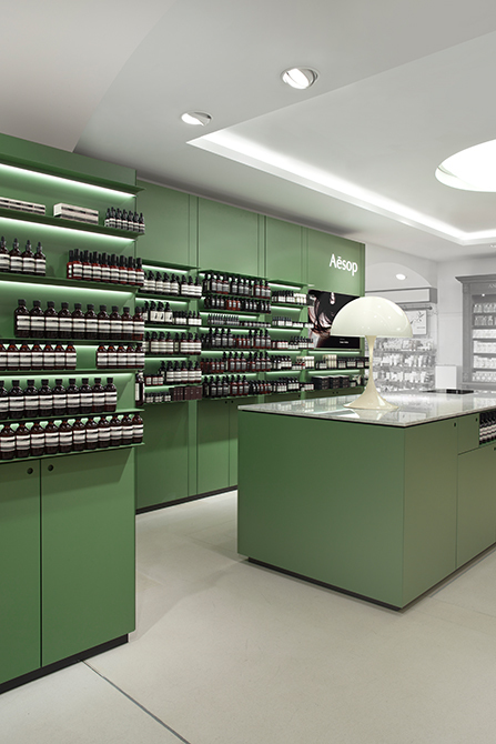 A new counter in Munich’s Ludwig Beck Department Store follows distinctive partnerships in Stuttgart, Bern and Lausanne. Employing measured restraint in material and palette, the central counter and surrounding shelving units are clad in soft-hued Reseda green powder coated metal, affording welcome respite from the busy surrounds. A streamlined countertop of dark Carrara marble affords the space contrast, while a vintage Louis Poulsen Panthella Table Lamp and a Hugues Steiner Bow-Wood No. 3 chair offer pleasing accents. Customers can explore and select from a complete range of skin, hair and body care products, distinguished by botanical and laboratory-generated ingredients of the highest quality.