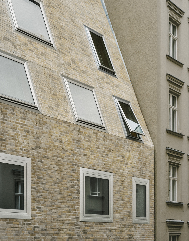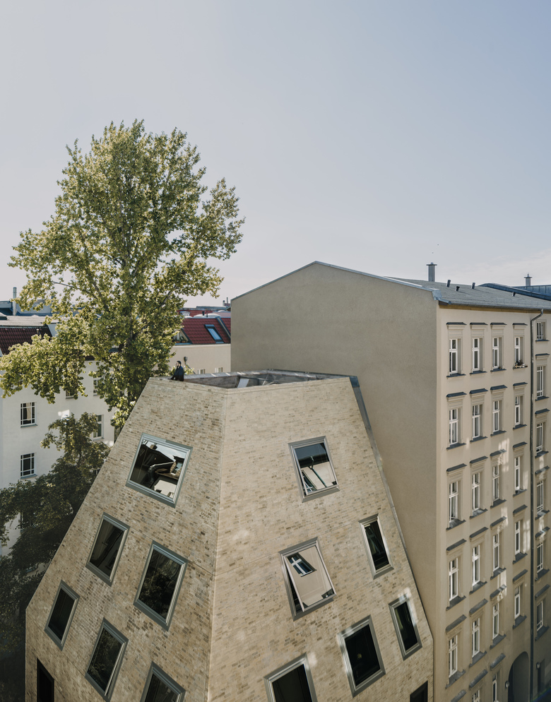 Tucked away in the inner courtyard of a block in Berlin’s Prenzlauer Berg neighborhood, an unusual residential house has emerged: With it’s steep roof looming some 10 meters above the building — more pyramid than cube — this boldly shaped building is entirely enveloped by a multi-colored brick skin. Irregularly proportioned aluminum-frame windows reference the history of these inner courtyards, often given over to industrial use in this area of the city at the time of the district’s initial development. At first glance, the appearance of the house does not seem to adhere to popular current conceptions of context-driven building expansions. In fact, it is the end result of tight parameters stemming from building regulations and historic preservation conditions. Used creatively as design tools, these restrictions led to a building that seems at the same time both familiar and strange, capable of blending into its surroundings while maintaining a strong independent character.