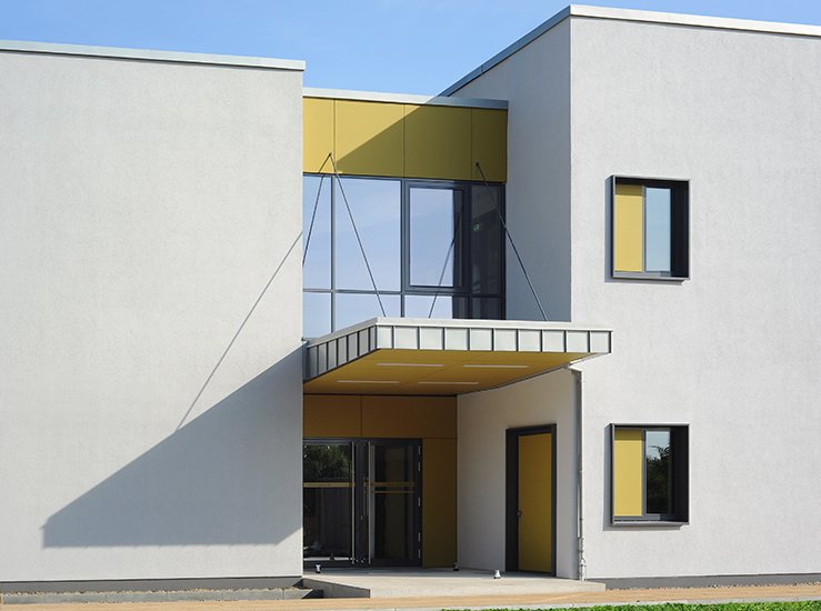 The two-storey new building as a training and meeting facility with nine classrooms, steps back from the existing 1930s buildings as a modern structure, but takes on the proportions of the surrounding houses.