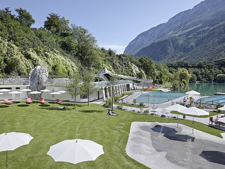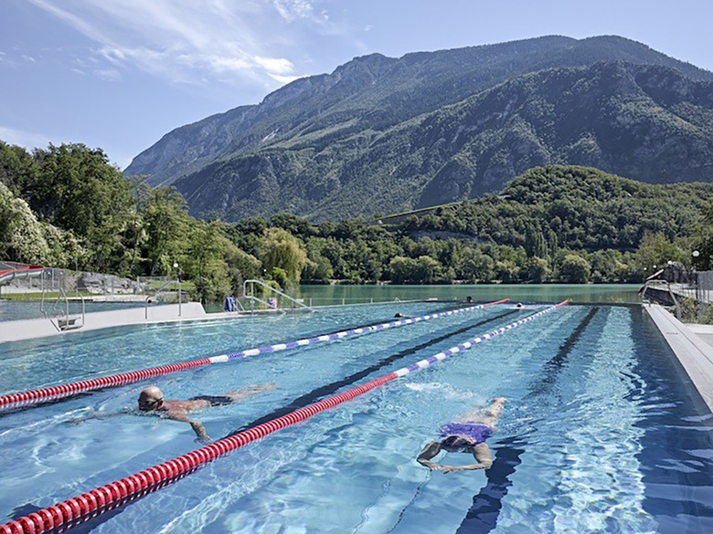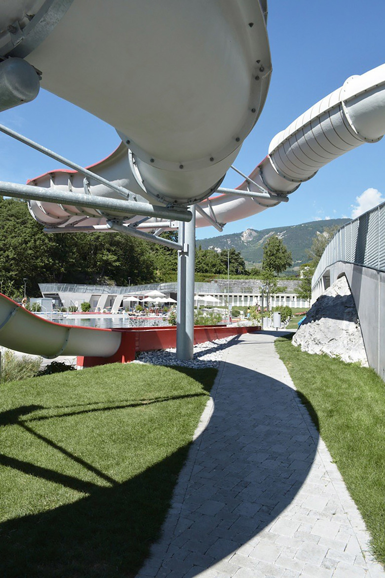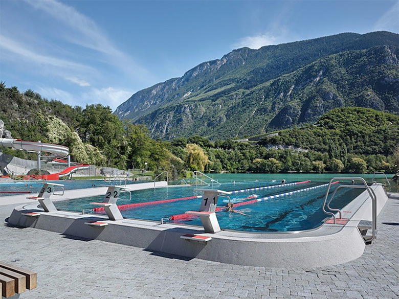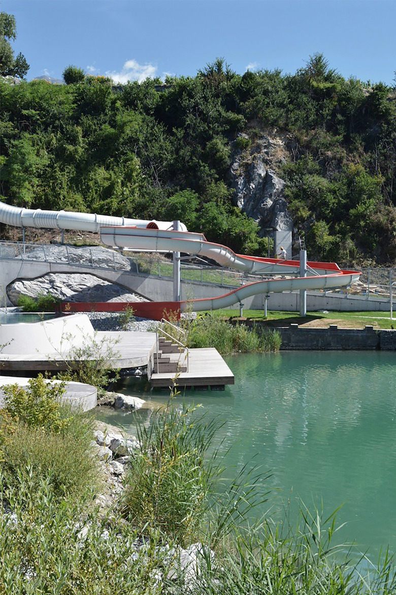In the spirit of old postcards from the Simplon train line, the sustainable renovation of the historical Baths of Géronde complex proposes a strengthening of the connection to the lake. The original semicircular changing-room building was extended both at the entrance and on the site’s northeastern slope as a promenade along the hillside, creating a scenic addition to the existing walking trail around the lake. The terraced levels formed by these new buildings allow for the harmonious integration of the spatial program.