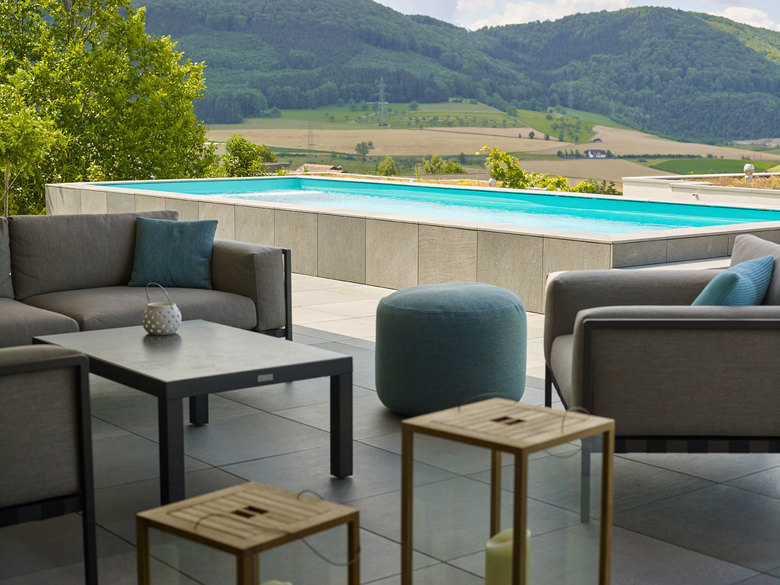 Bei diesem Schwimmbadbau, wurde das Schwimmbad auf Wunsch nicht bodeneben verbaut. Daraus resultierte ein Sitzbereich, welcher zum Verweilen am kühlen Nass einlädt.