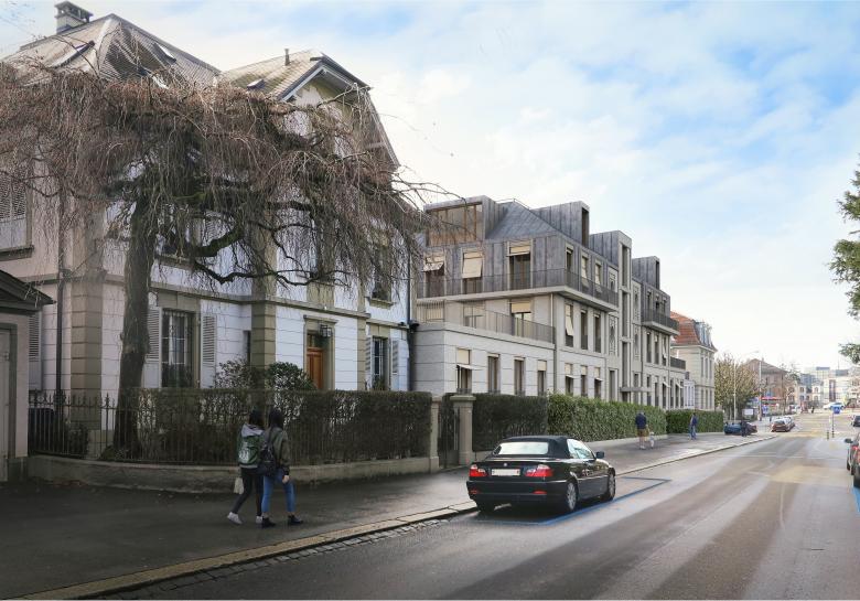Das bestehende, ursprünglich als Druckerei gebaute Gebäude wurde in den 60-iger Jahren vollständig neugestaltet. Durch den Umbau soll die Erscheinung des Gebäudes wieder einen Bezug zum Ursprungsbau von 1889 erhalten. Wenige, rohe Fassadenmaterialien und reduzierte Details geben dem Gebäude eine dezente Eigenständigkeit und lassen es nicht als Nachbau erscheinen.