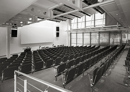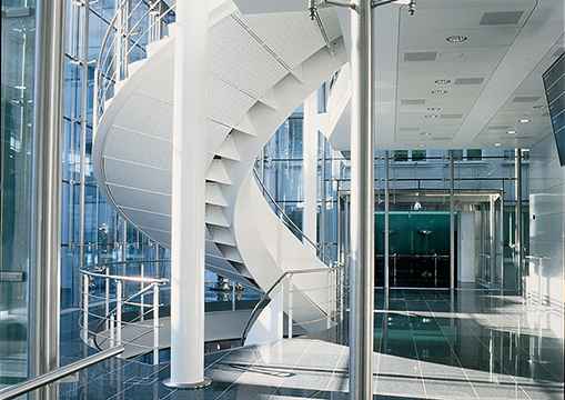 Conference center and meeting space. A unique architectural courtyard infill project comprised of a three-story, polished, transparent main body. An imaginative and elegant example of site re-use and maximization. A sculptural curving staircase is a key feature of the design.