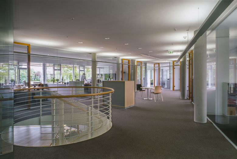 Das Atrium – Neben der signifikanten äußeren Gestalt bietet das Gebäude im Innern, durch seinen fünfgeschossigen Luftraum eine tagesbelichtete Kommunikations- und Erschließungszone mit Glasaufzug und eingehängten Spindeltreppen zur Kurzerschließung. Die angrenzenden Büros sind zum Luftraum mittels Glastrennwänden akustisch abgeschottet. Die verspringenden Galeriekanten ermöglichen offene Besprechungszonen und repräsentieren das offene und transparente Beratungskonzept.