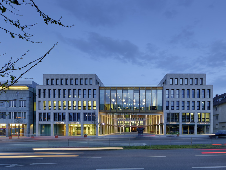 Mit seiner imposanten, steinernen Fassade aus hellem Dolomit und der Fortführung der vorhandenen Arkadensituation knüpft der neue Erweiterungsbau des Heilbronner Bankhauses konsequent an den bestehenden Gebäudekomplex an und integriert sich mühelos in die städtische Struktur entlang der Allee. Die Gesamtkomposition aus Bestand und Neubau erzeugt zwei gegenüberliegende Hofsituationen, so dass insgesamt eine ausgewogene Balance zwischen Baukörpern und Freiräumen entsteht. Der nach Osten geöffnete Grünhof schafft eine ruhige, entspannte Atmosphäre und kontrastiert zum Stadthof, der als attraktiver, lebendiger Aufenthaltsort zum Flanieren und Verweilen einlädt. Zwei, durch schmale Fensterelemente rhythmisch gegliederte Natursteinfassaden säumen den Eingang zum Stadthof. Der verglaste und hängende Sitzungssaal bildet das Bindeglied und schafft nicht nur einen wohltuenden Kontrast zur feingliederigen Architektur der Fassade, sondern auch eine natürliche Verbindung zwischen Innen- und Außenbereich.