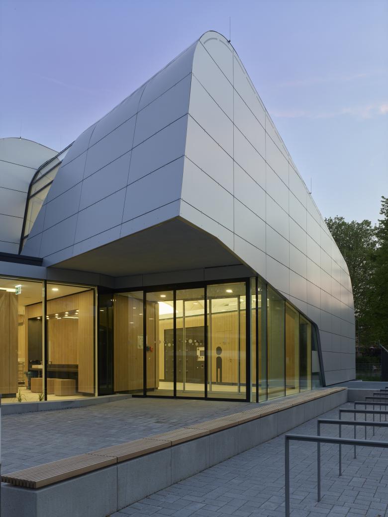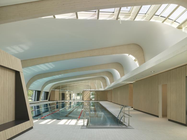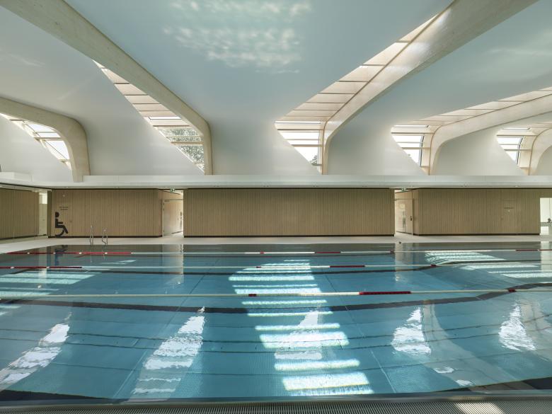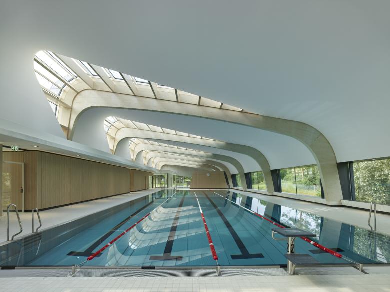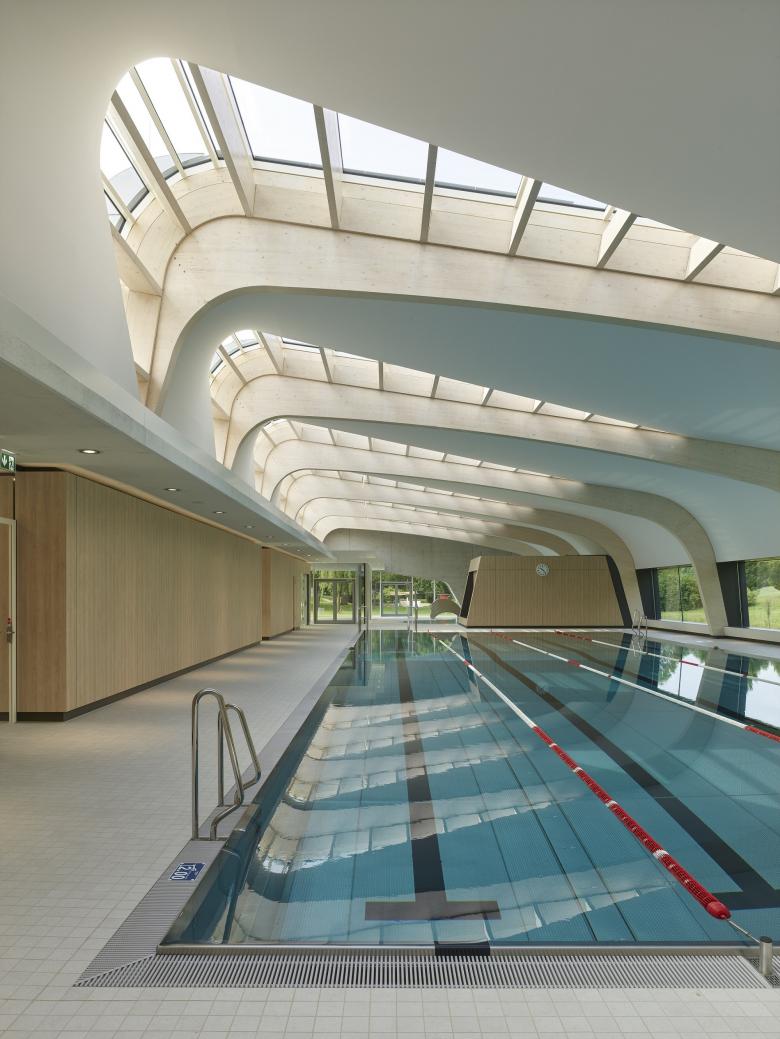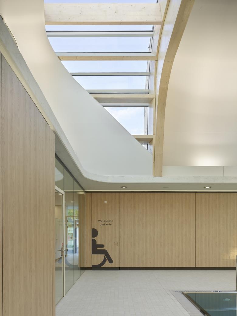 Der Haupteingang zum Hallenbad orientiert sich nach Osten, bildet Platzkante und Adresse und schafft kurze Wege zu den vorgelagerten Parkplätzen. Haupteingang und Foyer beherbergen eine Kasse, bzw. Automaten für den Winterbetrieb. Die Umkleideeinheit bedient sowohl das Hallenbad als auch das Freibad. Das Foyer mit Büro- und Infrastruktur lenkt den Weg zu den Umkleideeinheiten und ermöglicht einen guten Blick in die Badehalle. Das 25-m-Becken mit großzügigen Umgangsflächen ist nach Westen zum Grünzug, und das Kinderbecken am Südende nach Süden, mit Nähe zum Kinderbecken des Freibads, orientiert.