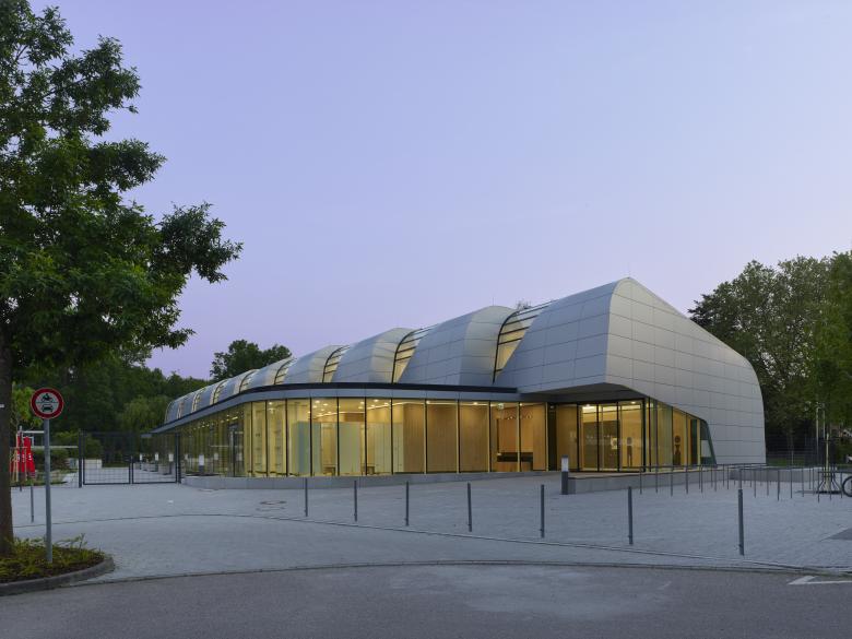 Ein Nord-Süd verlaufender Grünzug prägt das Grundstück und das Umfeld mit bestehendem Freibad und Veranstaltungshaus. Am Nordwest-Eck platziert und in Nord-Süd-Richtung ausgerichtet, bindet sich der Neubau schlank in die bestehende Situation ein. Die bestehenden Gebäude mit Garagen, DRK/DLRG und Kiosk bleiben erhalten und sind Bestandteil des neuen Ensembles.