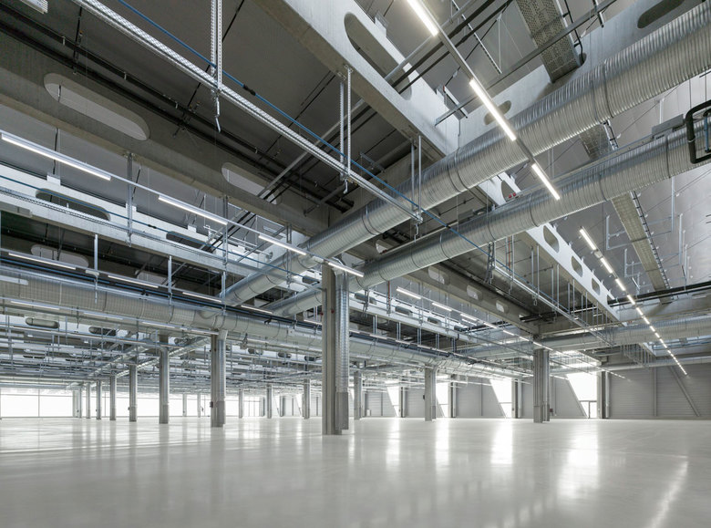 In order to increase speed of construction and to reduce costs the wide span beams of the halls and the sandwich elements of sheet metal for the roofing were prefabricated. The integration of mechanical systems and the grid-like structural system allowed for flexible floor layouts. The roof sheds are oriented to the north, classically, offering even daylighting while the opaque surfaces of the sheds orient to the south, ideally, for photovoltaic panels.