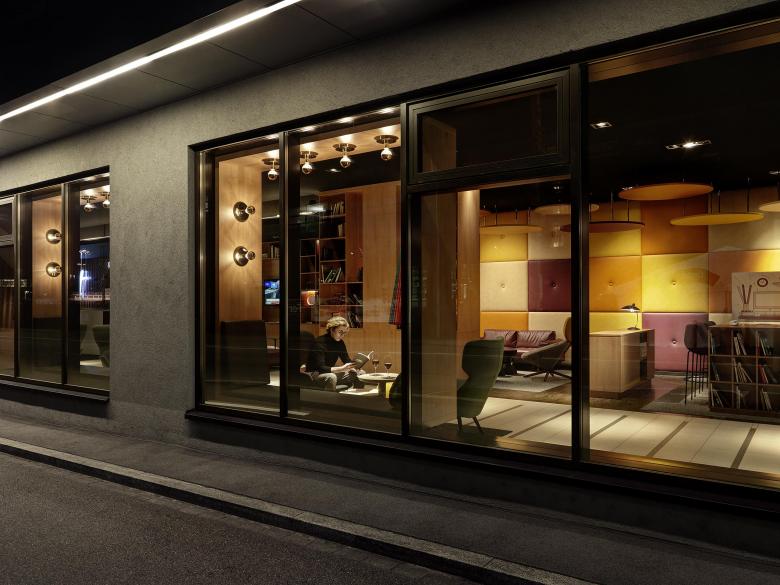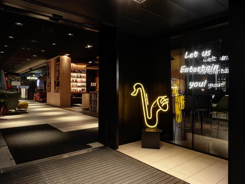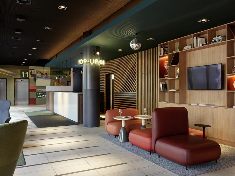 Unter dem Motto „Let us entertain you“ wurden alle Bereiche neu gestaltet. Der Leitgedanke für das Interior Design ergab sich aus der Lage direkt gegenüber des Zürcher Hallenstadions, in dem viele Konzerte stattfinden. Die Bar des Hotels wird regelmässig von Konzertbesuchern überrannt. Seit dem Umbau kann die Rezeption daher nun zu einer Pop-up-Bar umfunktioniert werden.