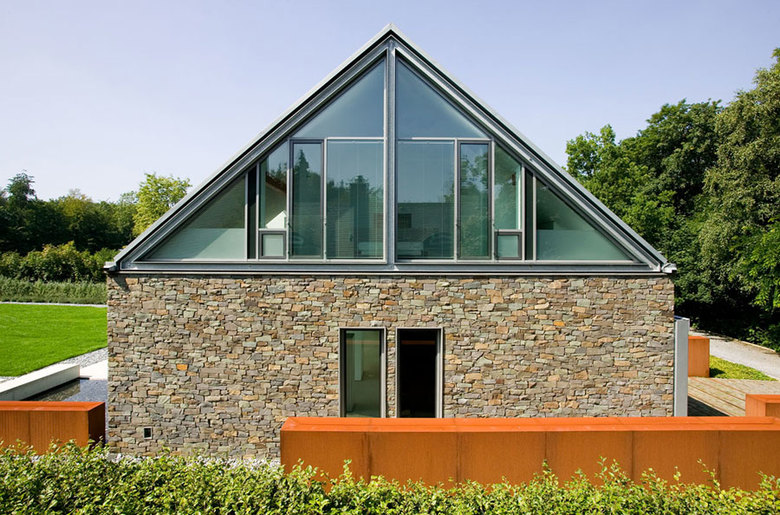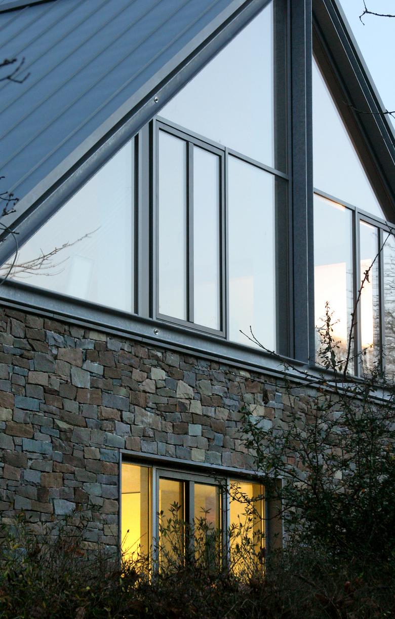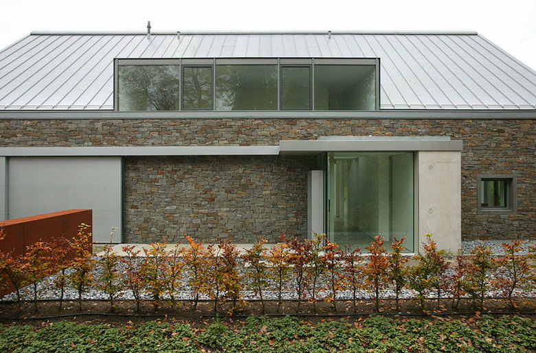 The Möllmann residence is located in a long-standing residential area, mainly comprising detached houses, outside Bielefeld. It was not possible to realise the requested flat roofed house because of the land use stipulations that required a symmetrical roof with an angle of 30 – 38°. Therefore the decision was made to use the traditional regional architecture as a point of orientation for the exterior of the house. The barns that are popular for agricultural use in this rural region were chosen as a particular reference for the formal design of the house. In line with the simple, unpretentious architecture of the barns the residence was designed as a lengthened, rectangular structure with a double-pitched roof without overhang. The masonry facades on three sides in quarry stone also refer to the traditional architecture in rural regions.