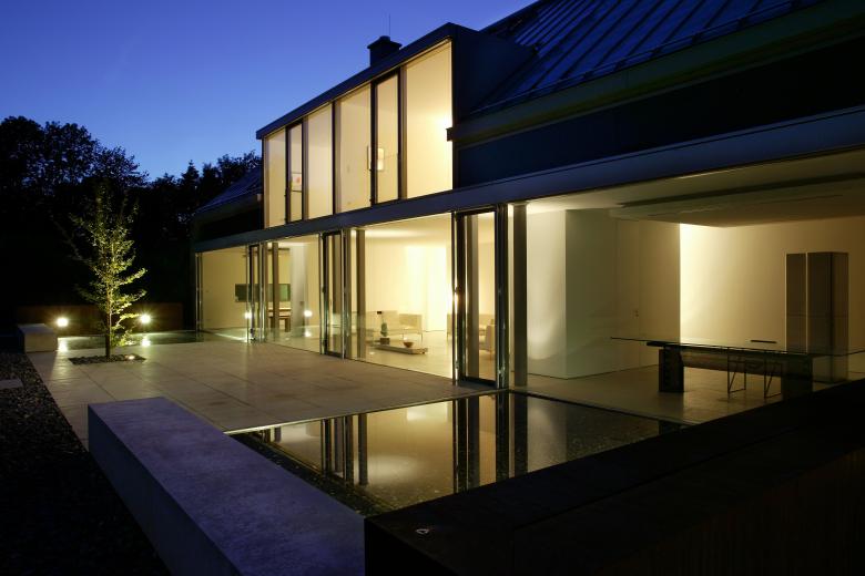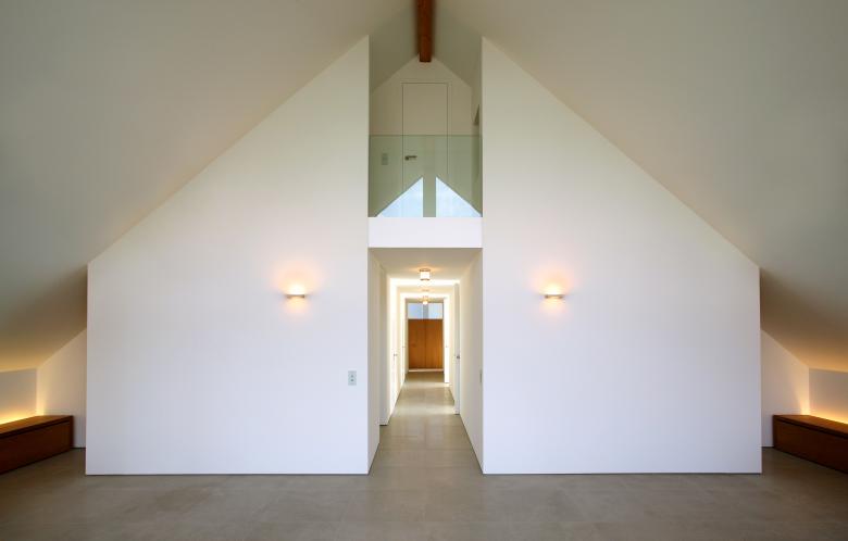 Although the house includes formal references to regional traditions the character of its interior is still consistently modern. This is made particularly clear in the open layouts that allow the rooms to flow into one another. The complete glazing of the side of the building shell that faces the garden, which allows the inside to melt into the outside through its lack of materials, is also a typical characteristic of a modern space concept. Numerous built in storage elements, benches and storage rooms provide sufficient storage inside the house. The books are also gathered in one place in a specially fitted library on the ground floor of the house. This meant that all the utility areas in the building could be kept free of objects for everyday use. The walls remain clear and can thus develop their spatial effects without disturbances.