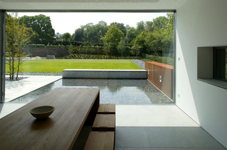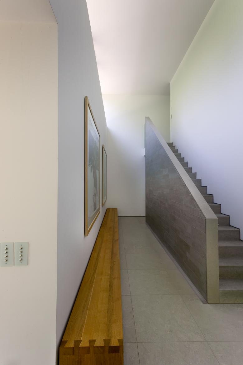 Reduction to only a few materials and colours – Italian sandstone for the floor, white plaster for walls and ceilings, oiled oak for the benches and glass and grey aluminium for the windows – gives the rooms a soothing calmness. With the support of a minimum of furnishings the architecture develops an ascetic austerity that makes the house a place of contemplative peace and allows the residents to escape from the hectic and noise of everyday life.