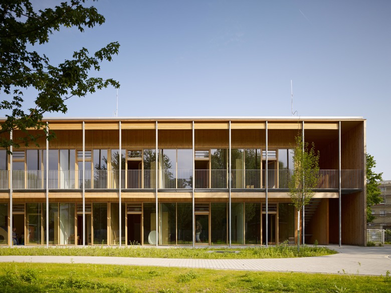 Für die Umsetzung des Projektes hatte vor allem der Einsatz von Baustoffen mit hoher ökologischer Wertigkeit höchste Priorität. In vielfacher Form prägt daher der natürliche Rohstoff Holz den Aufbau und die Konstruktion des Gebäudes. Außenwände aus vorgefertigten, aufgedämmten Massivholzelementen werden ergänzt durch tragende Innenwände aus massivem Brettsperrholz mit Oberlagen in Sichtholzqualität in Douglasie. Tragende, schallabsorbierende Hohlkastenträger bilden die Decke. Der Einsatz von Douglasienholz für die Verkleidung der Außen- und Innenfassade lässt das Gebäude als homogene Einheit erstrahlen und komplettiert die warme, kindgerechte Atmosphäre.