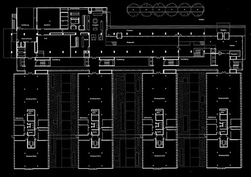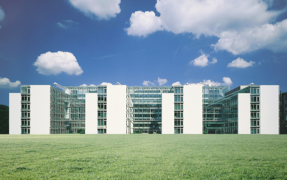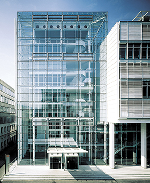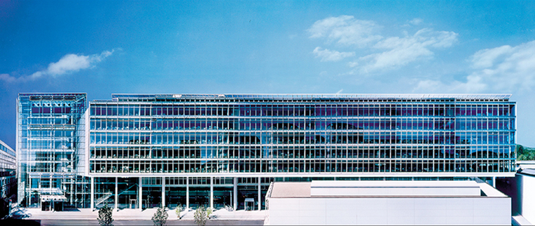 The main entrance and glass atrium of the long primary building serve as an extension of the connection corridor and exemplifies the overall unique design and future prominence of the project.