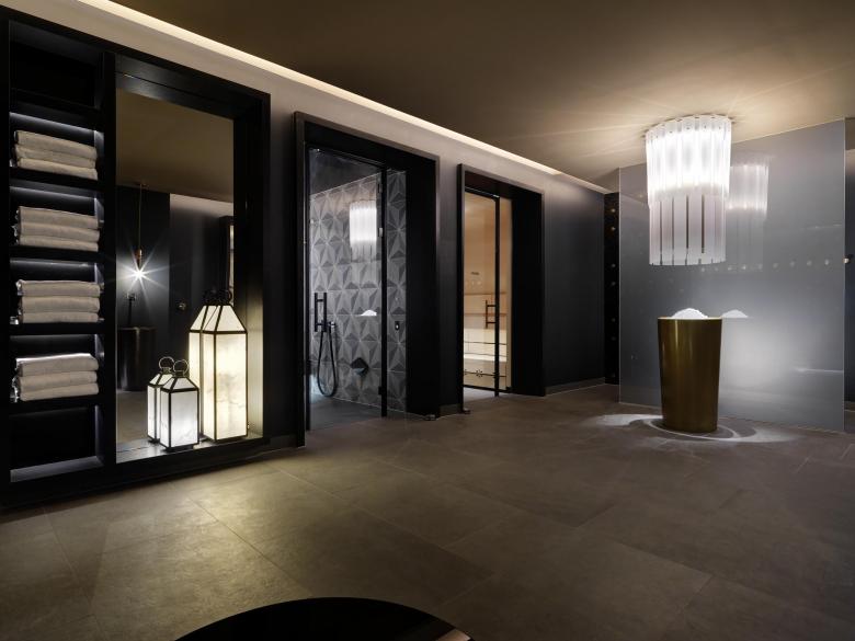 Viel Holz, hochwertige Materialien und gekonnt geführtes Licht unterstreichen auch im Spa- Bereich den 5 Sterne Plus Anspruch des Hauses.