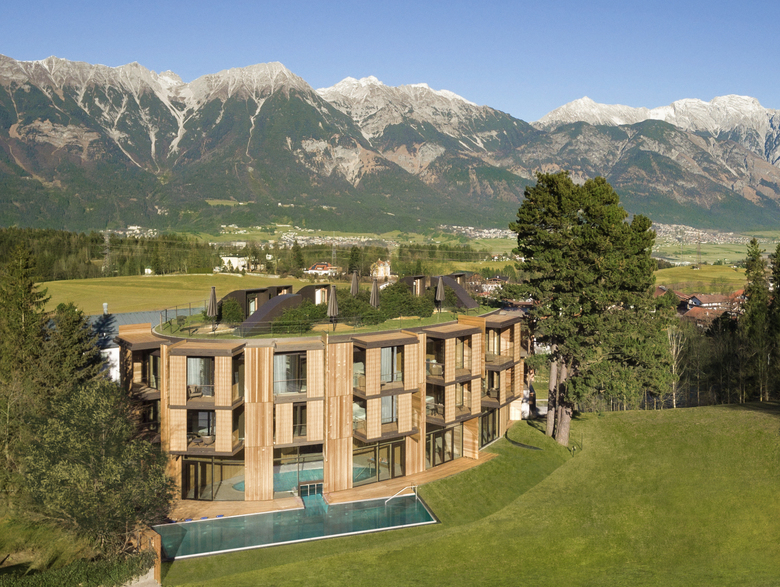 Following the opening in 2014 of the Lanserhof Tegernsee health resort, the Lanserhof health resort in the Austrian town of Lans was extended in 2016. The building complex of the resort consists of three sections—the main house and several additions and extensions. In addition to the refurbishment of the existing buildings, the work involved the replacement of one of the existing guest houses by a new oval building with 16 rooms and suites.