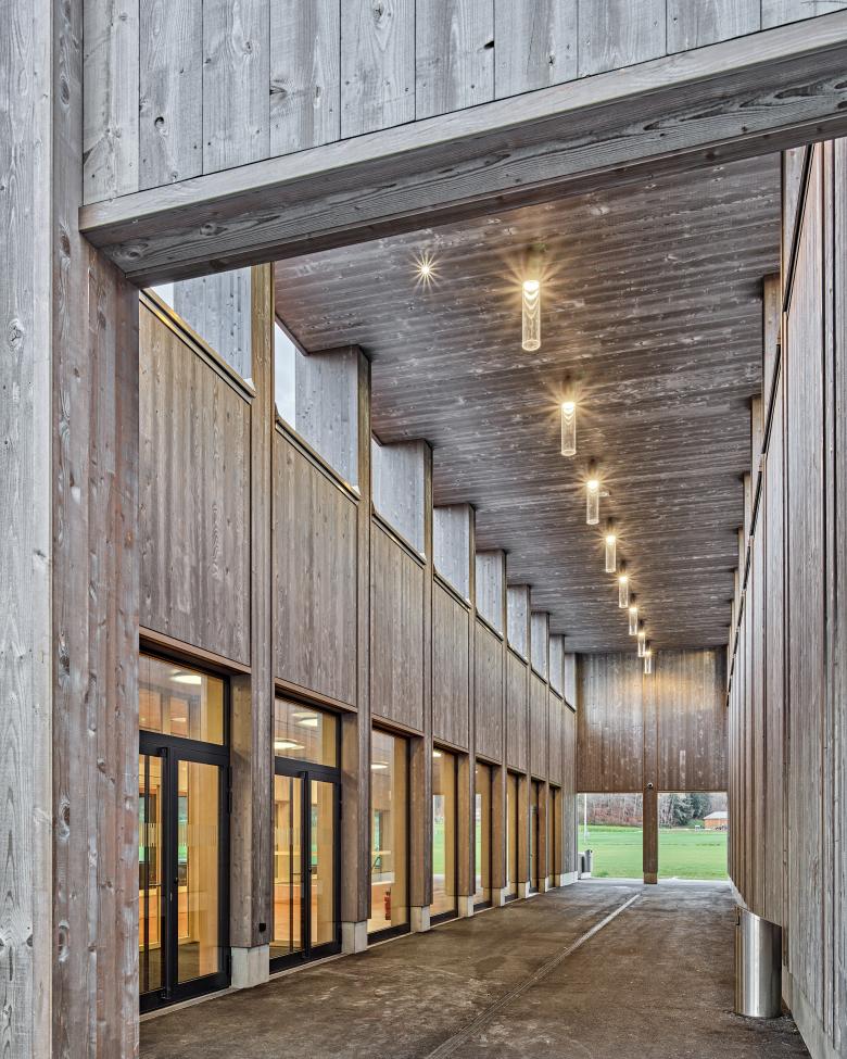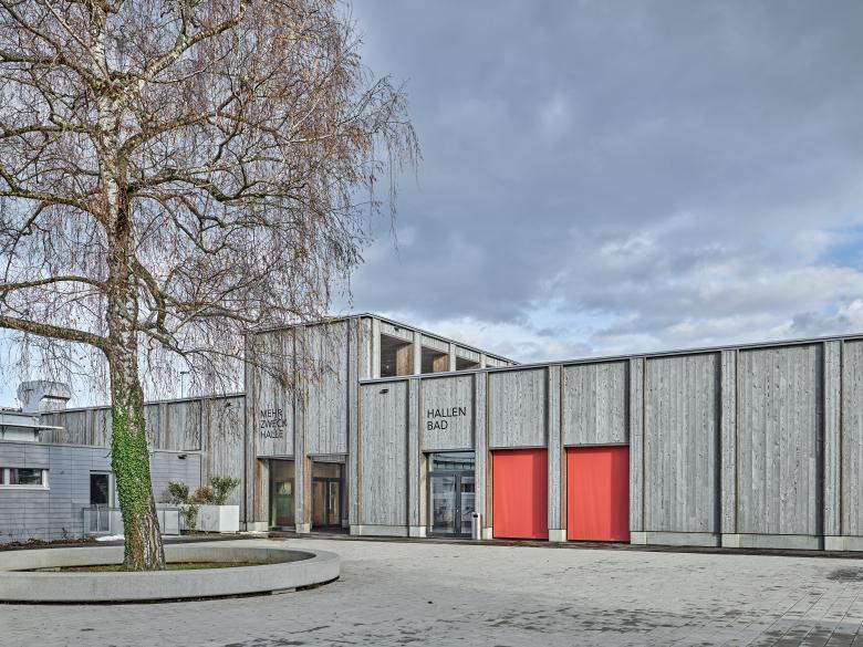Trotz der grossen Volumetrie der Hallen wirkt das Ensemble durch die Zäsur des 1-geschossigen Verbindungsbaus städtebaulich verträglich und optimal in die Umgebung integriert. Im Sinne des „Weiterbauens“ werden gut funktionierende Platzsituationen erhalten und das bestehende Freiraumnetzwerk um neue Freiräume mit hoher Aufenthaltsqualität ergänzt. Das überhohe Aussenfoyer erzeugt einen markanten Hochpunkt auf dem liegenden Gebäudekörper. Seine Fronten werden mit einem vertikalen Rhythmus belegt, der dem dahinterliegenden Tragraster entspricht. Grössere Felder mit offenen, verglasten und geschlossenen Fassadenflächen wechseln sich ab. Im Bereich der Durchgänge wird dieser Rhythmus nicht durchbrochen – nur die Fassadenhülle löst sich auf und es entsteht eine Arkade, die das Bauwerk in seine beiden Hauptfunktionen gliedert: Mehrzweckhalle und Hallenbad. Beide erhalten eigene Adressen können unabhängig voneinander betrieben werden und werden doch durch die durchgängige Gestaltung zu einem Ganzen zusammengefasst.